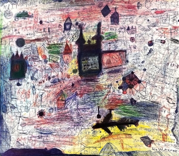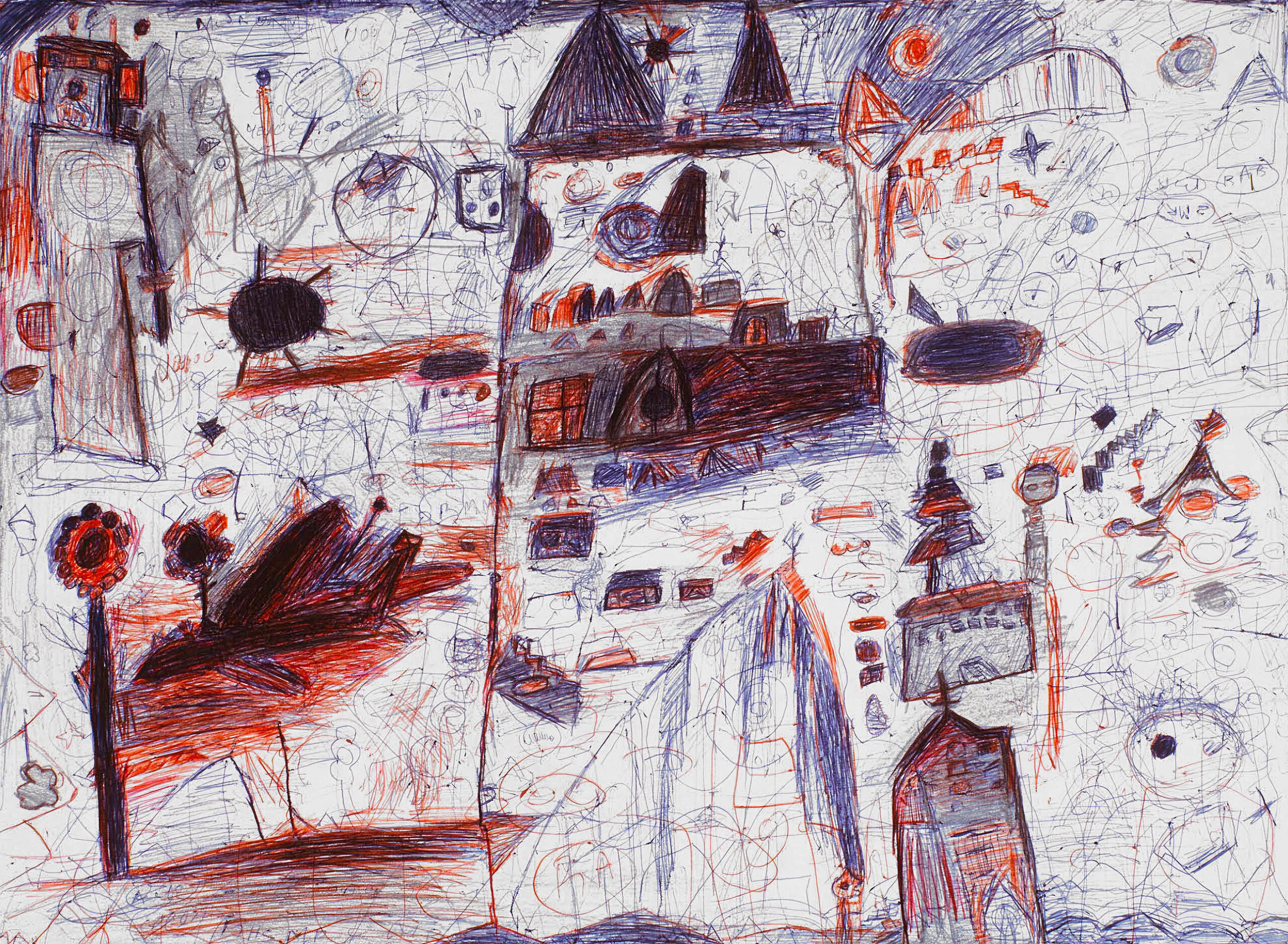 On ignore tout de la vie de Yassir Amazine avant son passage à l’atelier de Luc Mondry et Nicole Babilas à La Clairière. Dans ses dessins réalisés aux stylos noir, rouge et bleu, Amazine semble livrer un véritable combat : la feuille est déchirée par des traits répétés, violents, obsessionnels. D’innombrables lignes s’entrelacent pour former des œuvres d’une densité impressionnante. On y perçoit à la fois l’énergie libératrice du trait et sa force envahissante, presque étouffante. La brutalité du geste, sa fièvre et sa rage sont aussi saisissantes que les thèmes guerriers qui parcourent chacun de ses dessins.