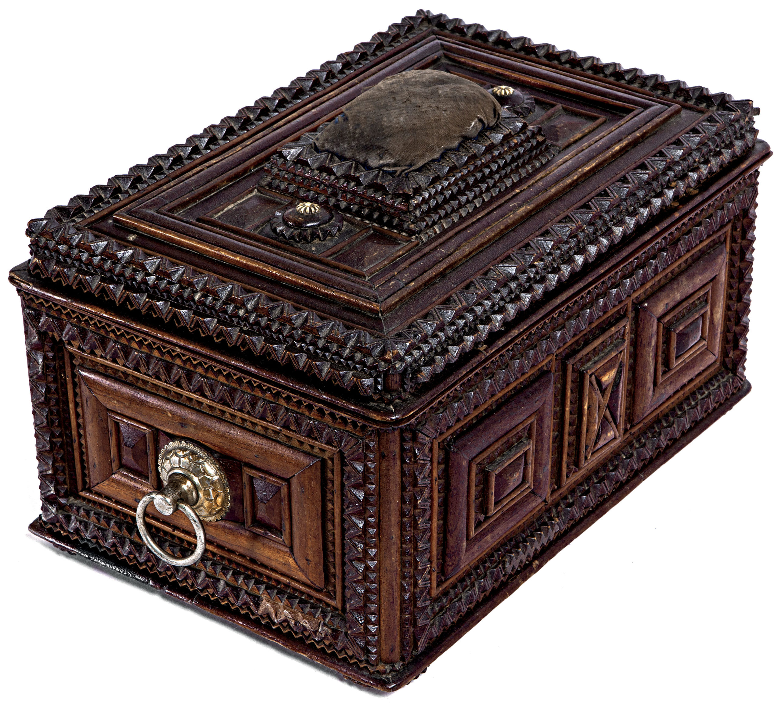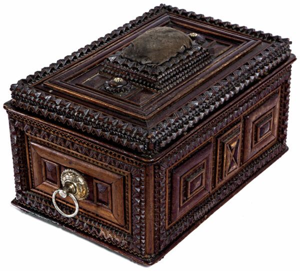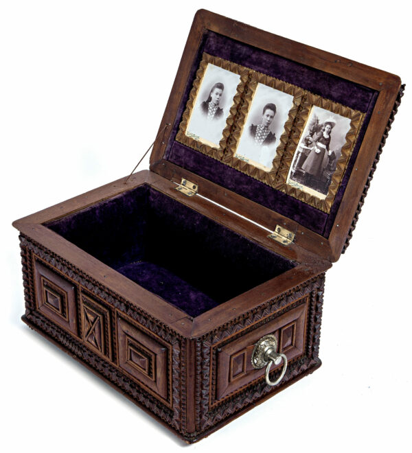 De cette boîte à couture élégamment sculptée, on ne sait à peu près rien, excepté qu’elle a été acquise aux États-Unis. Les photographies ornant l’intérieur, recouvert de velours, sont signées du studio bruxellois de Gustave Narcisse (1857-1920, Bruxelles), ce qui pourrait constituer un indice de son origine. Elles montrent la même jeune femme à gauche et au centre, et une autre à droite.