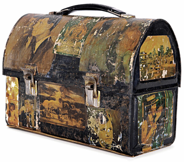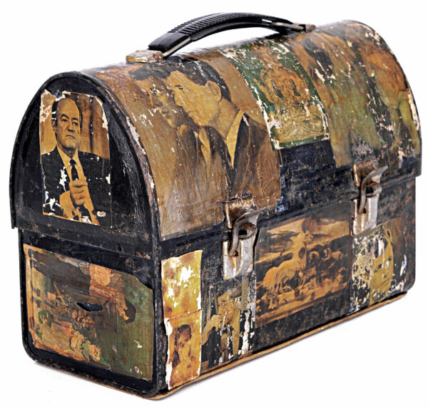 La lunch box, qui date des années 1960, a été quant à elle fabriquée aux États-Unis. Sur toutes ses faces ont été collées des coupures de presse d’hommes politiques, comme la famille Kennedy, mais aussi de stars du show business.