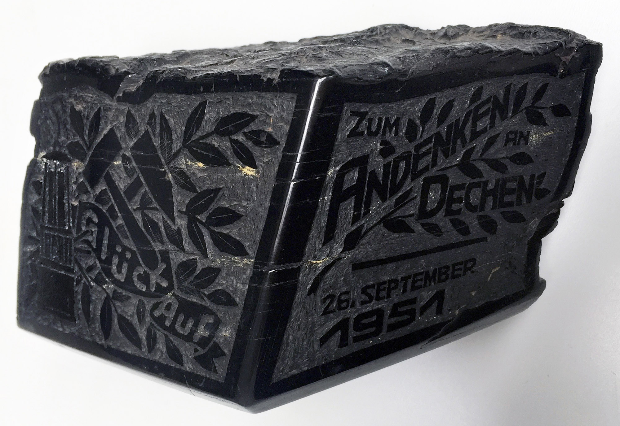 Le bassin houiller de la Sarre fait partie du gisement sarro-lorrain qui affleure vers Neunkirchen puis s’enfonce vers le sud-ouest en direction de la Lorraine. Extrait au début à flanc de coteau puis ensuite à l’aide de puits verticaux, la production s’accéléra dans le seconde moitié du XIX puis engendra un regroupement jusqu’à la fermeture finale de la Bergwerk Saar le trente juin 1912. Ce bloc d’anthracite en forme de losange contient 93 à 97 % de carbone et, outre son usage comme combustible, devenait aussi électrode pour les moteurs électriques.Gravé il indique la prise de retraite d’un mineur (les pics croisés) le vingt-six septembre 1951. Cet objet est un rare témoignage d’une vie d’homme dont les conditions de travail furent terribles.