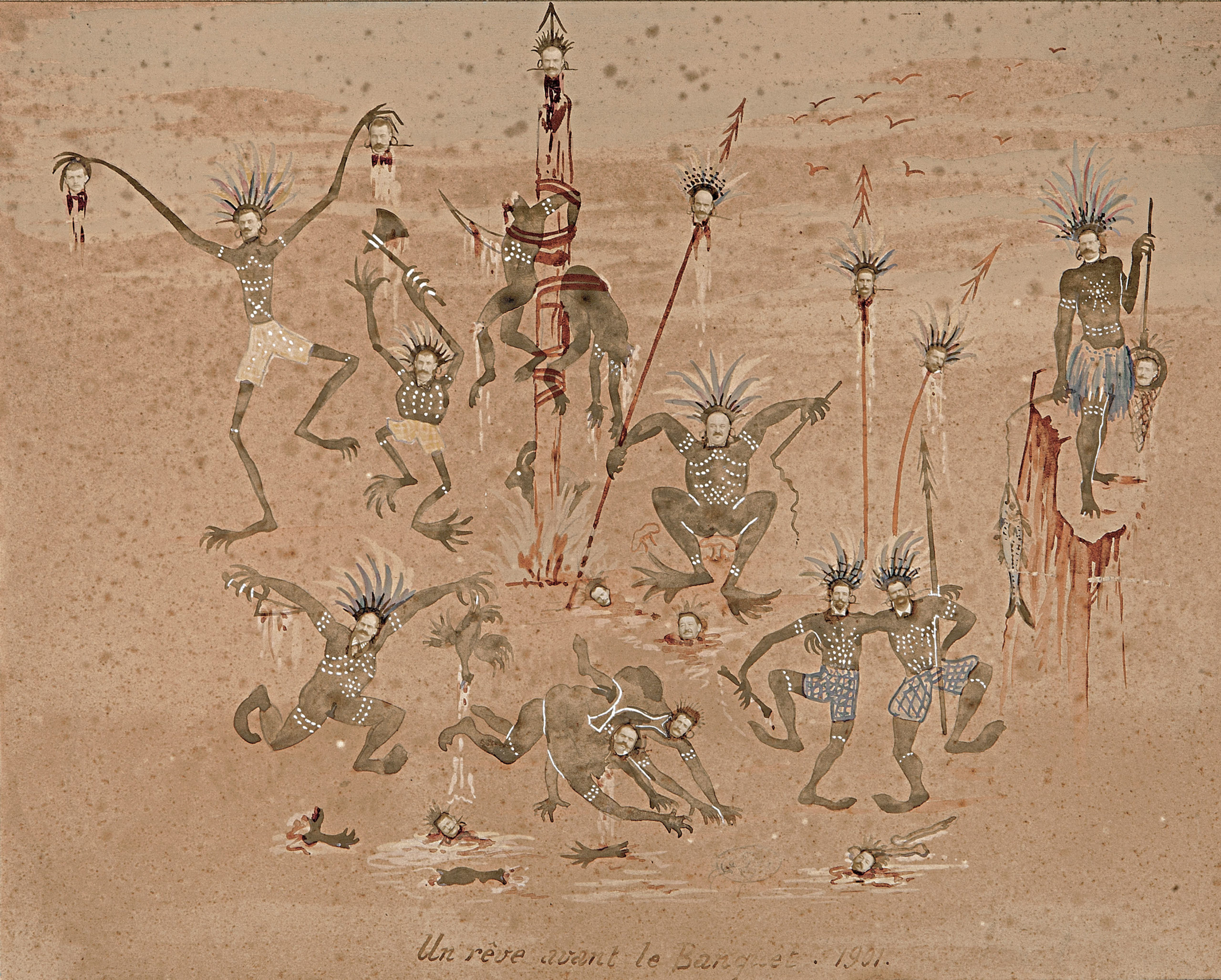 Nous ne savons rien de l’auteur de cette œuvre intitulée Un rêve avant le banquet. Particulièrement dérangeante, elle peut être lue de plusieurs façons. On peut y voir une mise en scène scabreuse affichant toute la cruauté des sauvages qui ont décapité leurs victimes ou des envahisseurs qui ont exterminé leurs ennemis avant de se glisser dans leurs corps. Il pourrait tout aussi bien s’agir d’un combat sanguinaire à l’issue duquel tout le monde serait perdant, finissant découpé en morceaux. Le spectateur pourra s’interroger sur le fait que les têtes de ces sauvages hybrides ont été soigneusement découpées dans des photographies. Qui étaient ces personnes ? Dans tous les cas, relevons que ce sont uniquement des hommes.