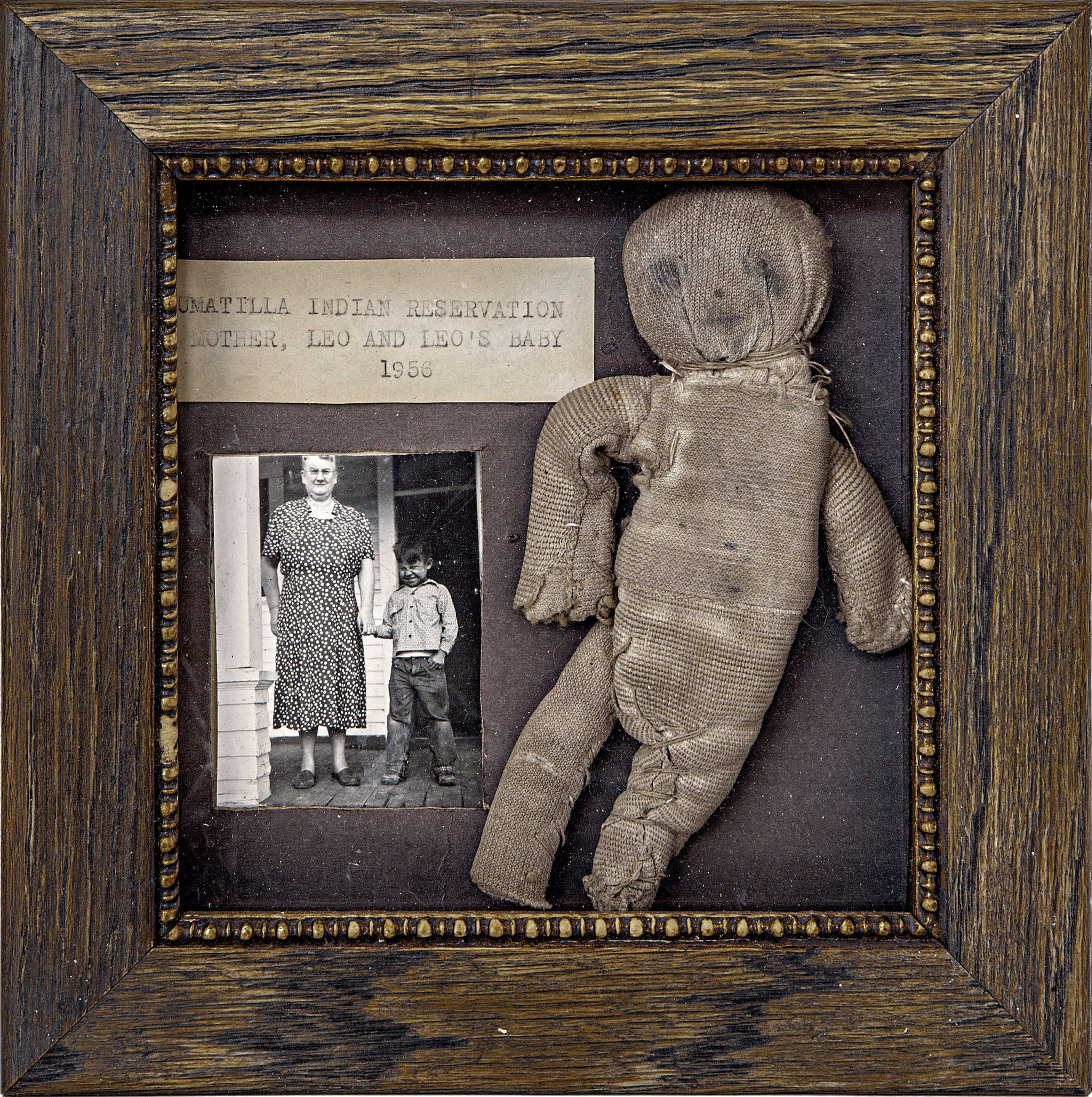 Le peu que l’on sait de cet objet, sorte de boîte encadrée, provient de ce qui y est écrit. L’étiquette faisant office de titre indique en anglais : « Réserve indienne d’Umatilla / Maman, Leo et le bébé de Leo ». Au dos, on peut également lire : « Mrs Orr and her student Leo 1956. Umatilla reservation Leo’s homemade doll » [« Mme Orr et son élève Leo 1956. La poupée faite maison de Leo, de la réserve d’Umatilla »]. On peut présumer que l’auteur de cet objet (au moins de l’étiquette) est l’enfant de Mme Orr, laquelle avait pour élève le petit Leo, indien de la réserve d’Umatilla. Située dans le nord-est de l’Oregon, à l’est de Pendleton, cette réserve fut créée à la suite du traité du 9 juin 1855 établi entre les États-Unis et les tribus indiennes Walla, Cayuse et Umatilla.