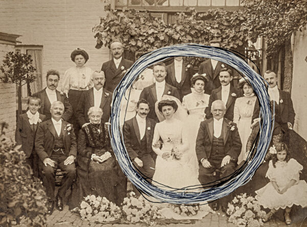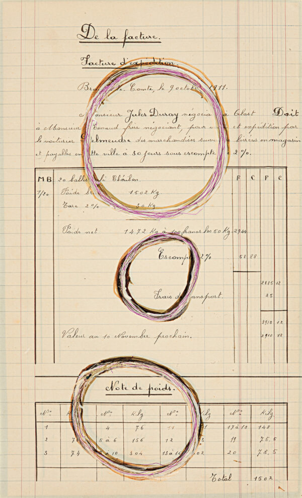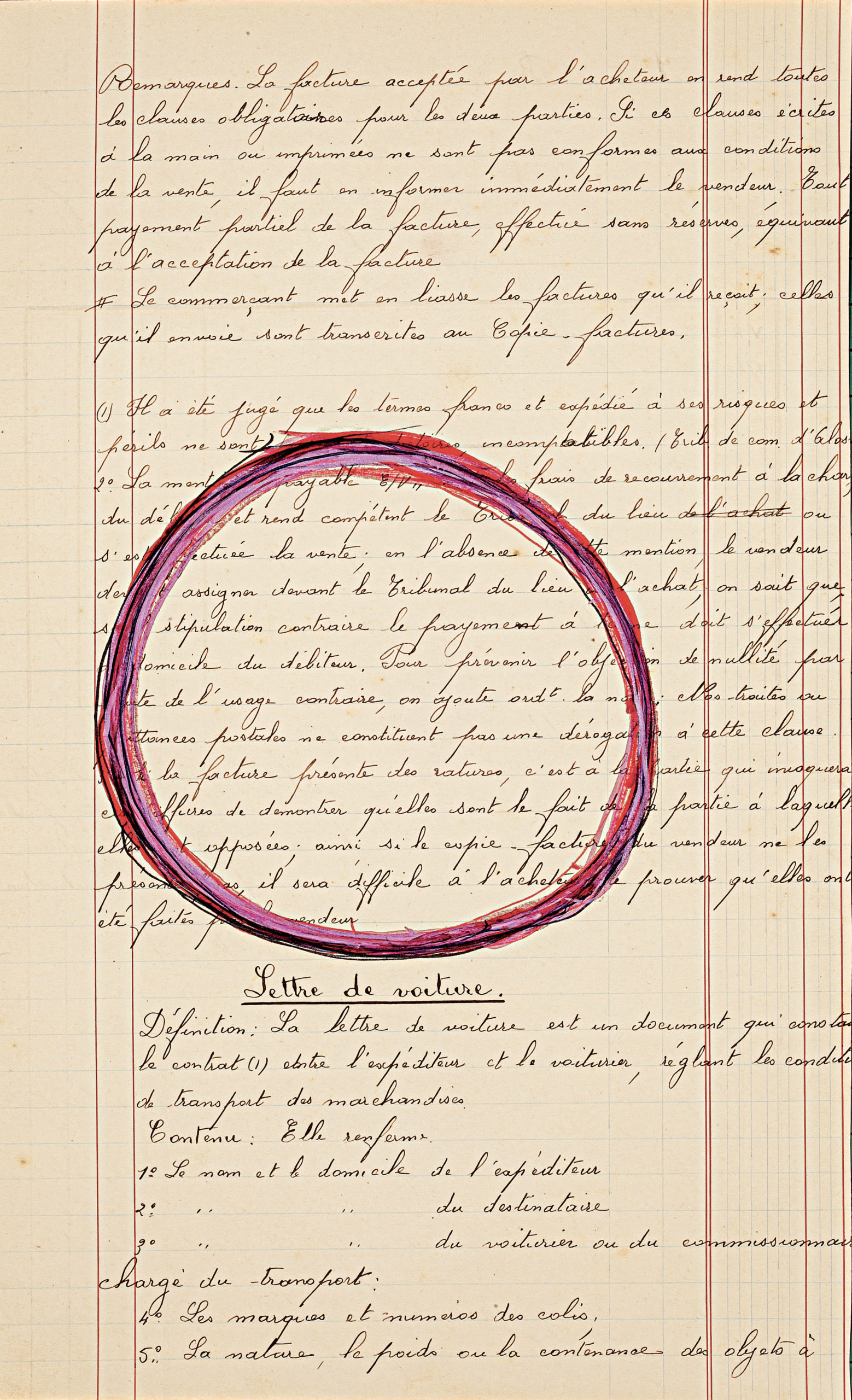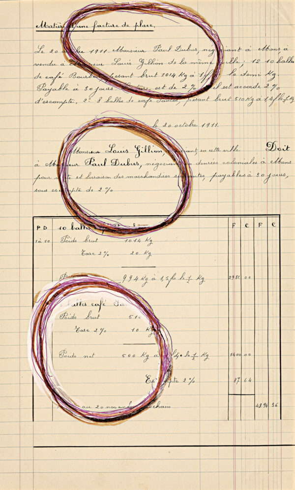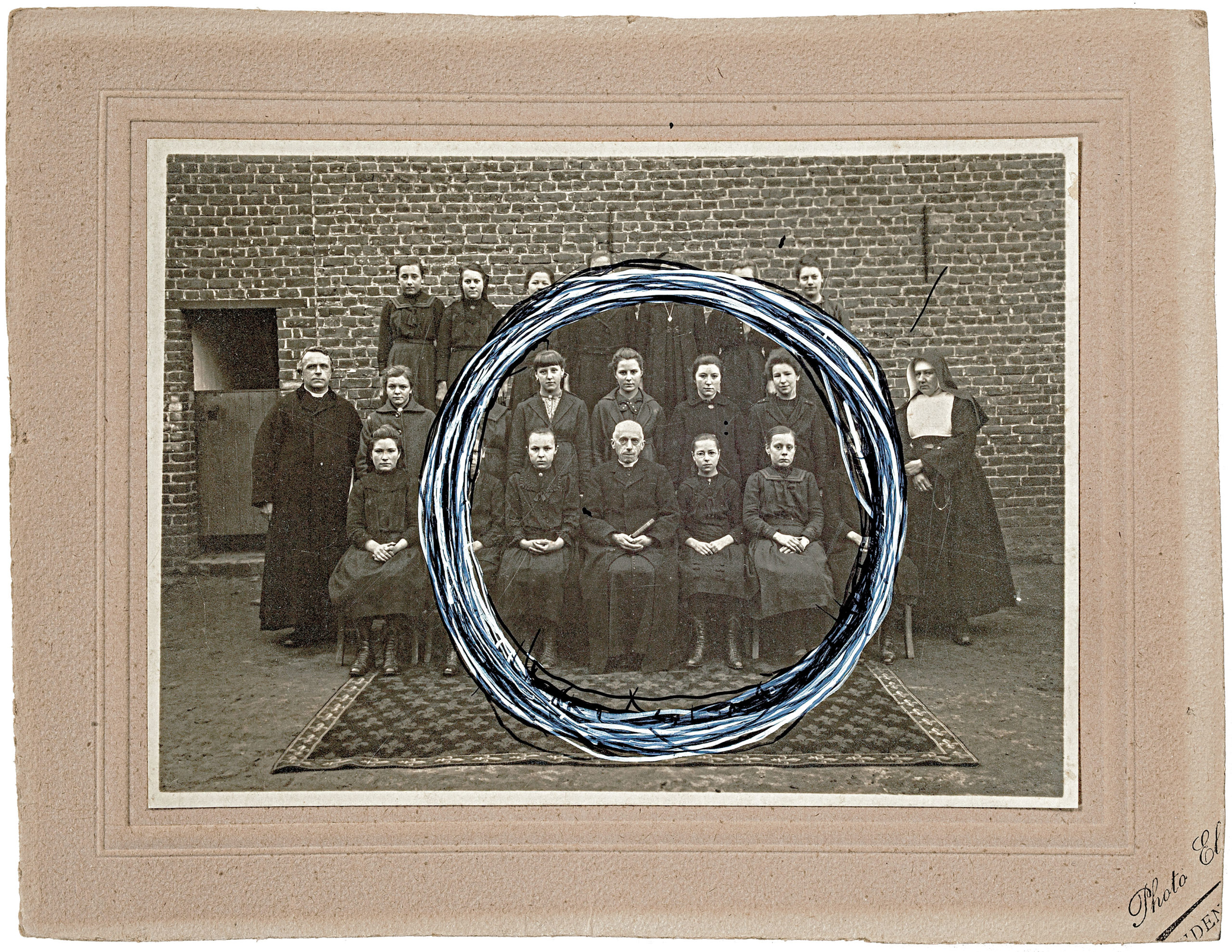 Séverine Hugo est accueillie à La « S » Grand Atelier en 2015. Sans manifester de réel attrait à l’égard de la création artistique, elle a néanmoins souhaité fréquenter l’atelier de dessin pour profiter de son atmosphère particulière, mais aussi de son approche singulière de la fragilité. Sa peur du jugement l’empêchant de se sentir autorisée à créer elle-même, elle a d’abord simplement observé la pratique des artistes autour d’elle. L’atelier comme lieu d’émulation et le climat de bienveillance qui émane de celui-ci ont apaisé ses craintes, qui se sont progressivement évanouies pour laisser place à un authentique besoin d’expression par le dessin. Une cohérence graphique a rapidement émergé de l’ensemble de ses productions. Séverine Hugo aime superposer les traits de feutres ultrafins en un geste répétitif, dessinant des cercles qu’elle appelle régulièrement « mes anneaux de Saturne ». Tout support l’intéresse, en particulier les papiers déjà manuscrits et les photographies anciennes aux modèles rigides et aux postures statiques. Le cercle semble souvent y prendre forme autour d’un élément spécifique de l’image, à la manière d’une cible, entourant d’une certaine façon un détail dissimulé qu’elle choisit de révéler.