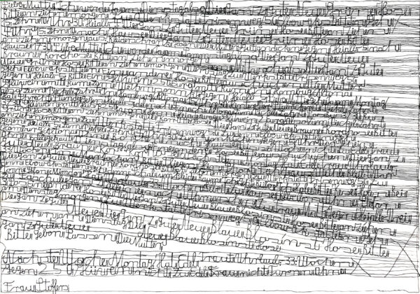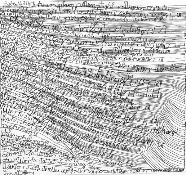 Atteint dès l’enfance de graves troubles psychiques, Harald Stoffers est placé dans une institution psychiatrique à l’âge de 22 ans. Là, il commence à écrire de simples mots sur de petits papiers qu’il distribue autour de lui. Progressivement, son travail évolue : il se met à rédiger de longues lettres adressées à sa « chère maman » (« Liebe Mutti »), disposant le texte de manière à former des lignes méticuleusement tracées, comme des portées musicales. Les formats de ses œuvres sont très variés, certains atteignant plus de six mètres. Depuis 2001, Stoffers travaille régulièrement à l’Atelier Der Villa, devenu Galerie Der Villa, une structure d’accueil située à Hambourg.