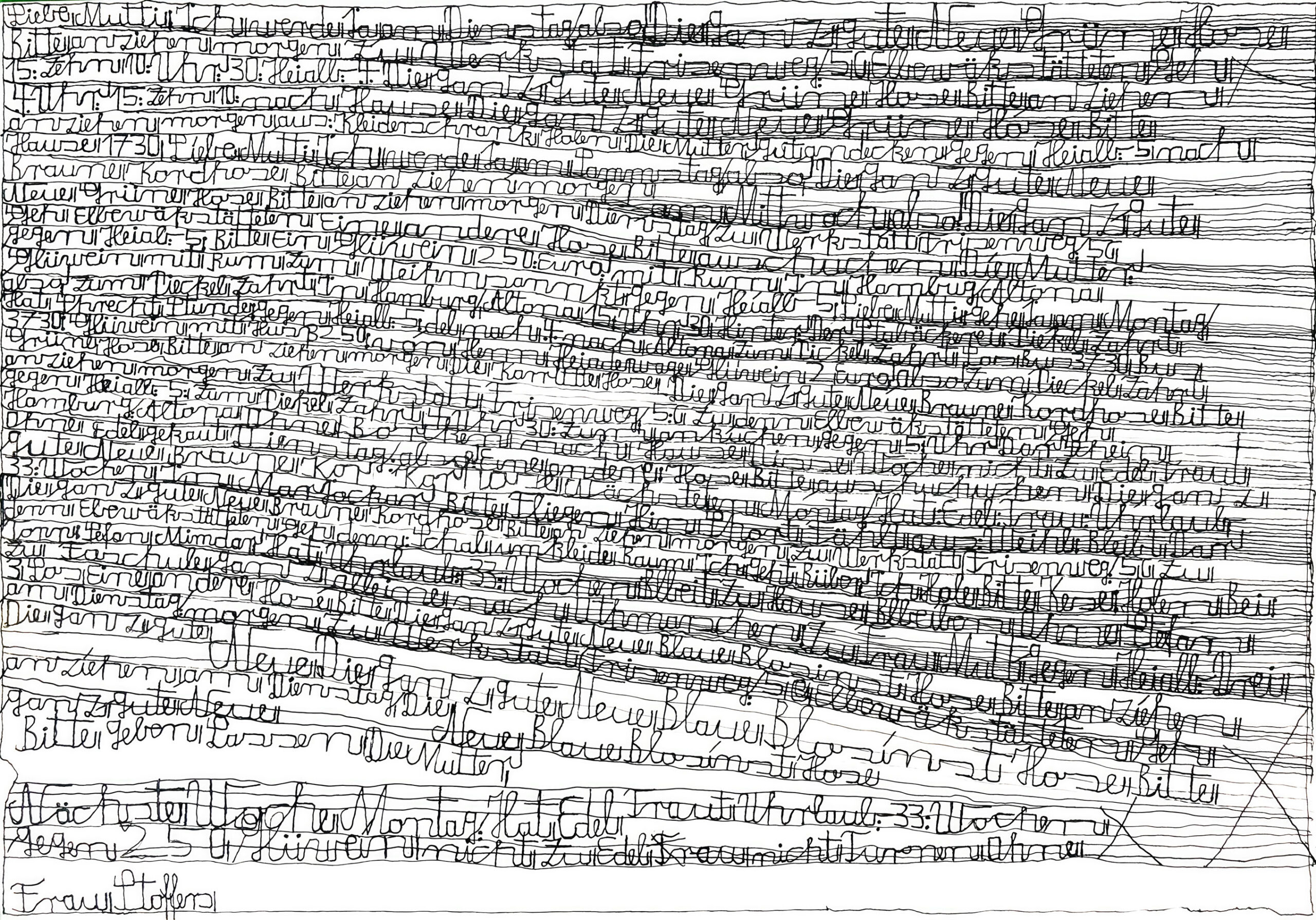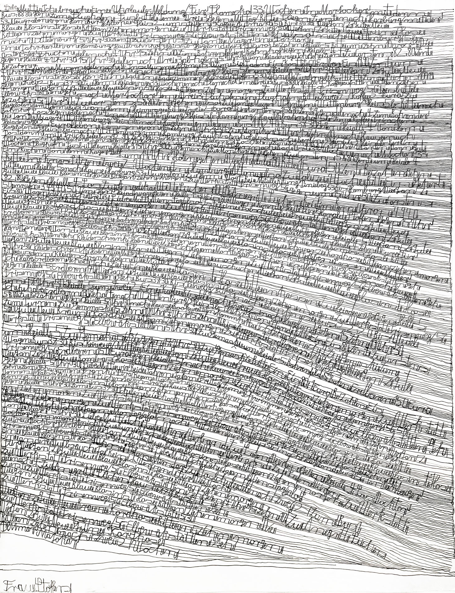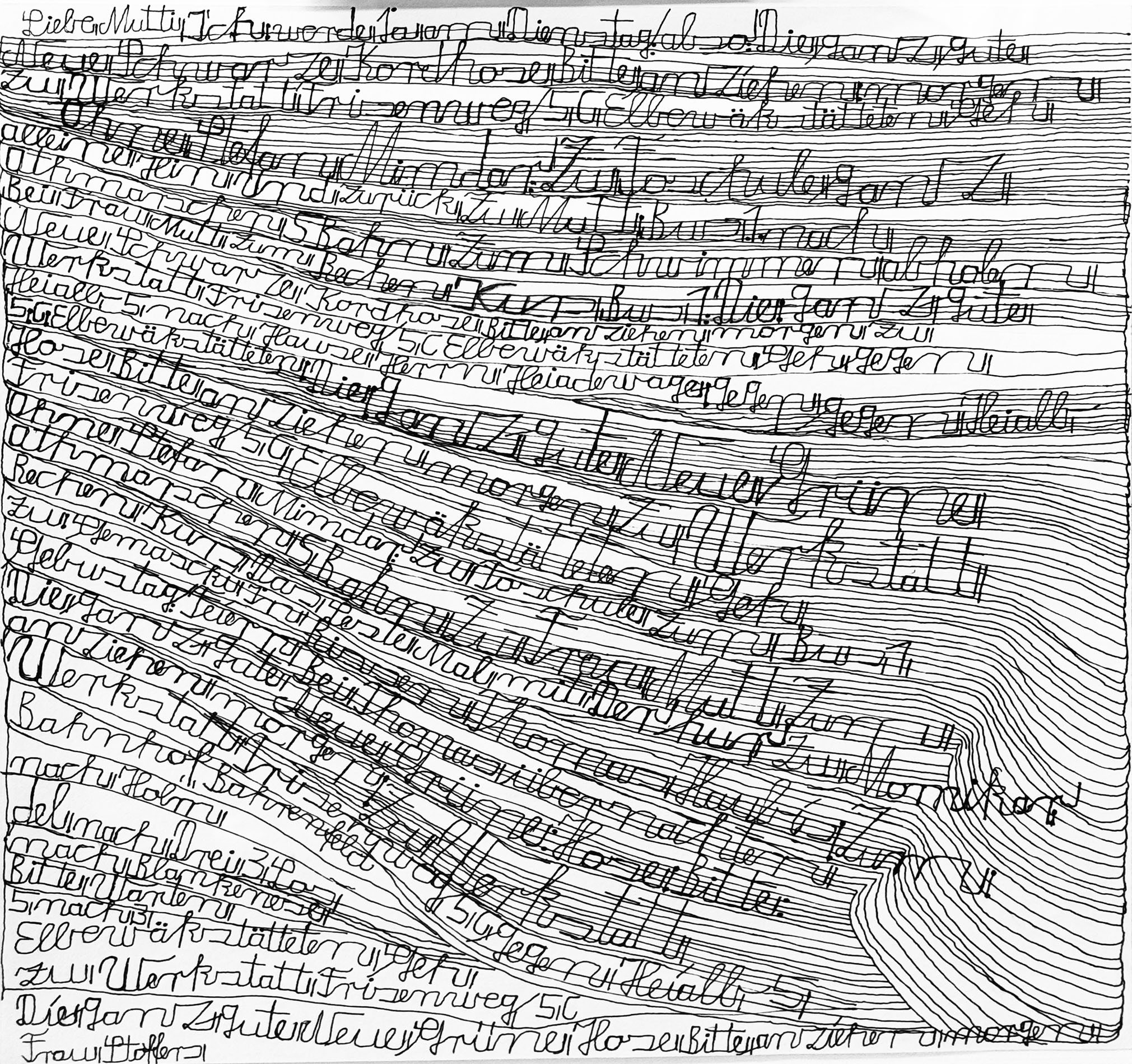 Atteint dès l’enfance de graves troubles psychiques, Harald Stoffers est placé dans une institution psychiatrique à l’âge de 22 ans. Là, il commence à écrire de simples mots sur de petits papiers qu’il distribue autour de lui. Progressivement, son travail évolue : il se met à rédiger de longues lettres adressées à sa « chère maman » (« Liebe Mutti »), disposant le texte de manière à former des lignes méticuleusement tracées, comme des portées musicales. Les formats de ses œuvres sont très variés, certains atteignant plus de six mètres. Depuis 2001, Stoffers travaille régulièrement à l’Atelier Der Villa, devenu Galerie Der Villa, une structure d’accueil située à Hambourg.