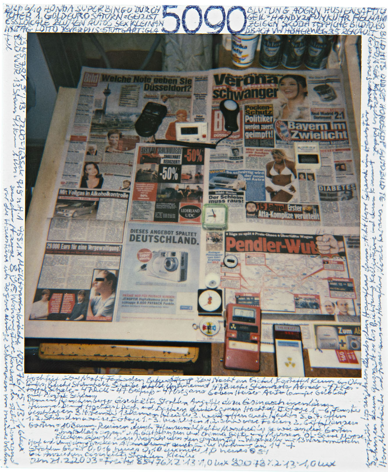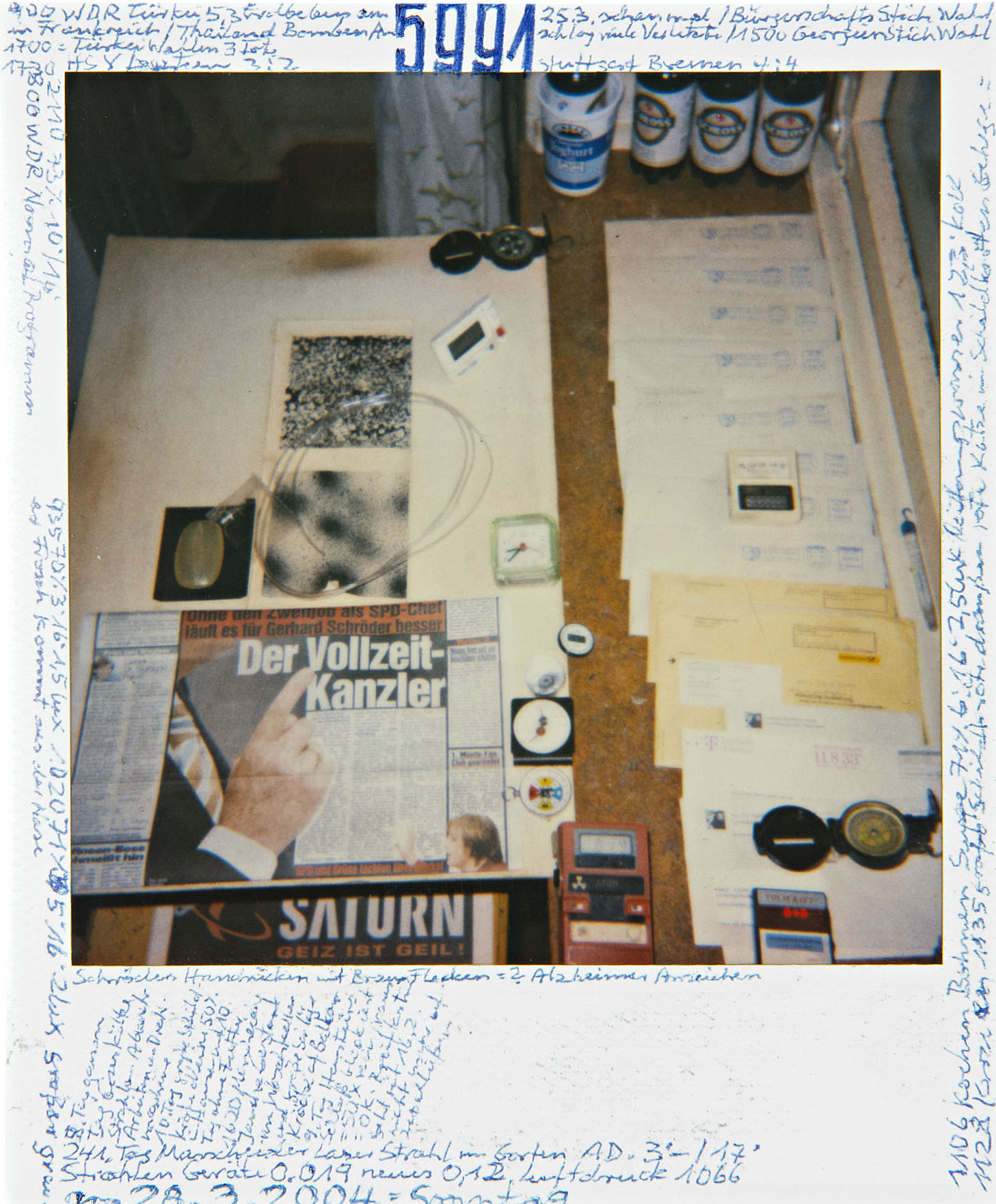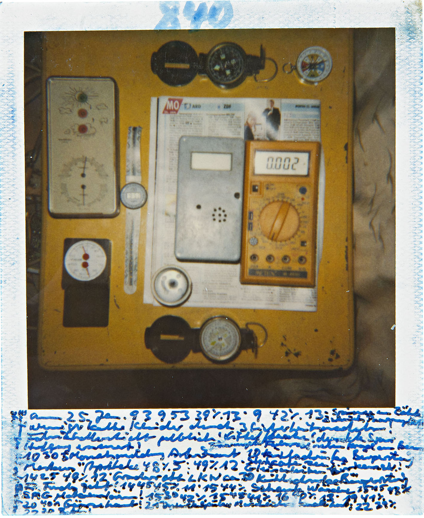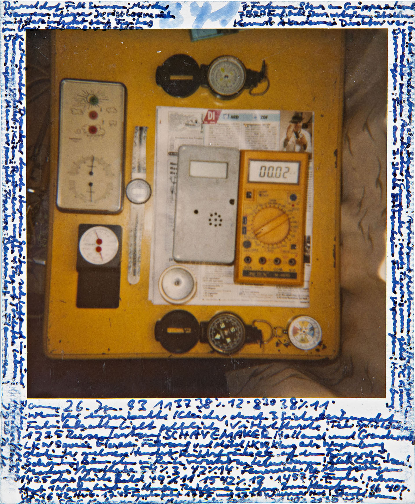 Horst Ademeit spent the last 40 years of his life to documenting the existence of “cold rays,” recording their detrimental effect on himself and his surroundings. To this end, he took thousands of Polaroid and (later) digital photographs, which he numbered and dated and used as a record of his everyday observations. On the margins of the photographs, he wrote in nearly illegible writing the smells, sounds and atmosphere that surrounded him the moment he pressed the shutter release. His table was piled with magazines (mostly BILD-Zeitung), letters and food; using a Geiger counter, light meter and other measuring devices, he calculated the intensity of the cold rays. He tried to discover who was responsible for all of his and the world’s problems. “It is just a question of time before I catch them red-handed,” he claimed. He used a lathe to make hundreds of little balls, which he carried with him in order to disrupt the cold rays. His daily routine was fully determined by his inventorying and by the logical rules of his system.