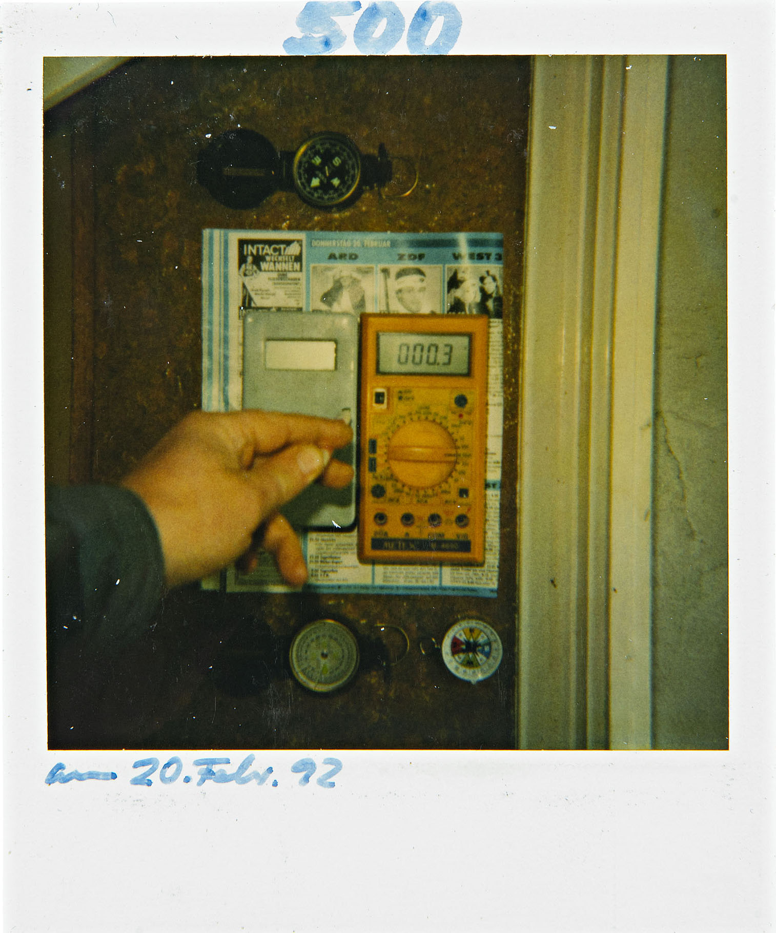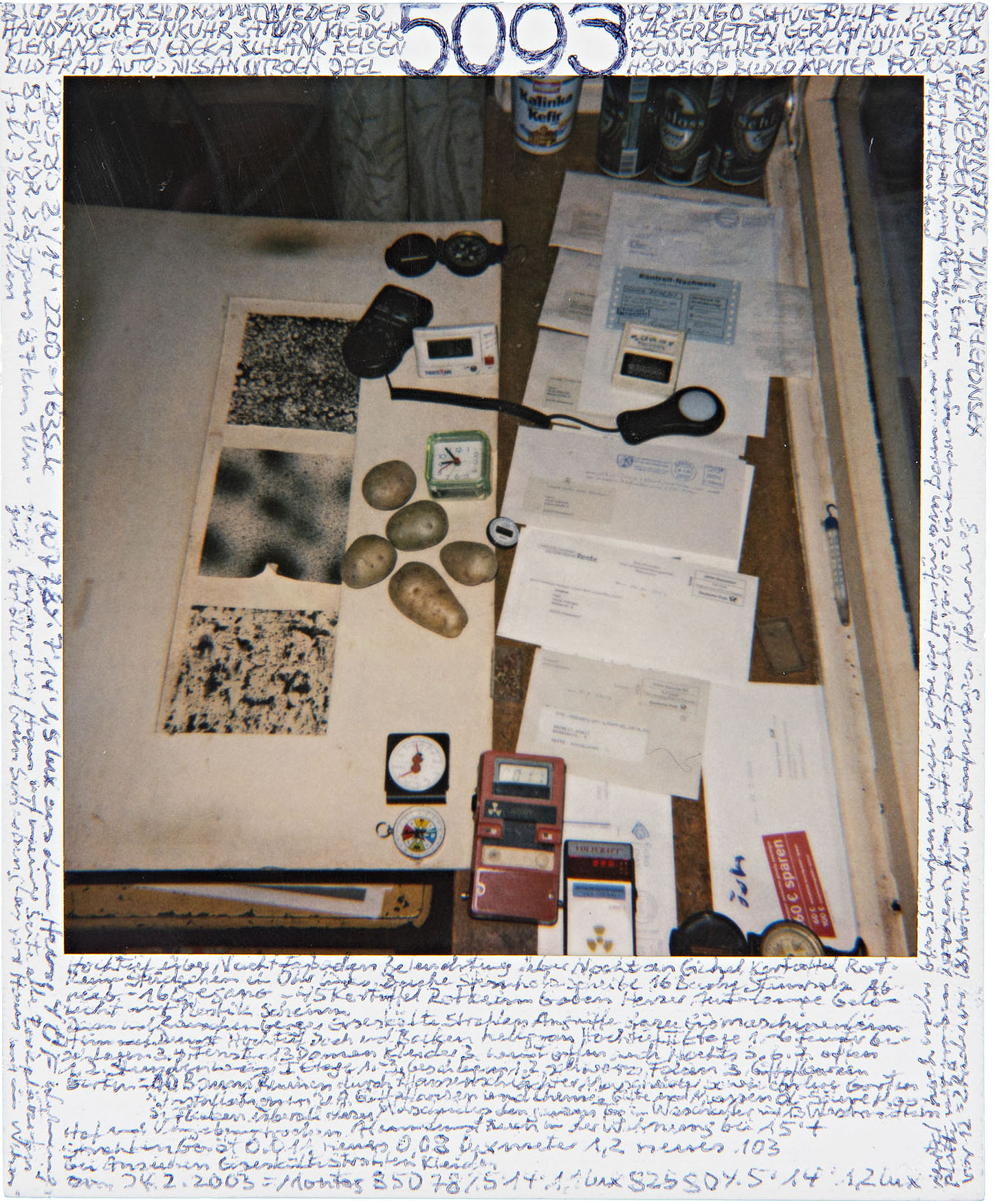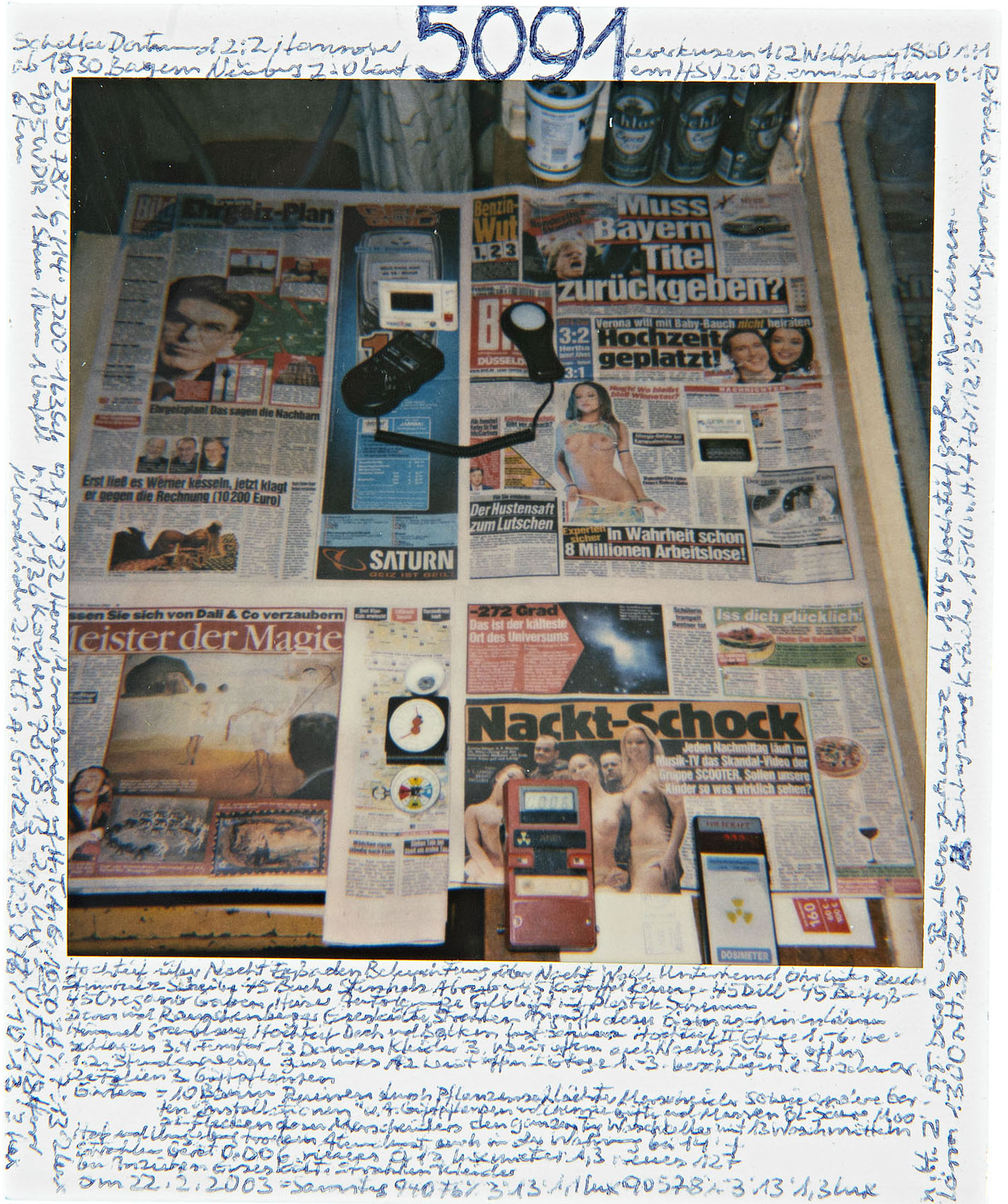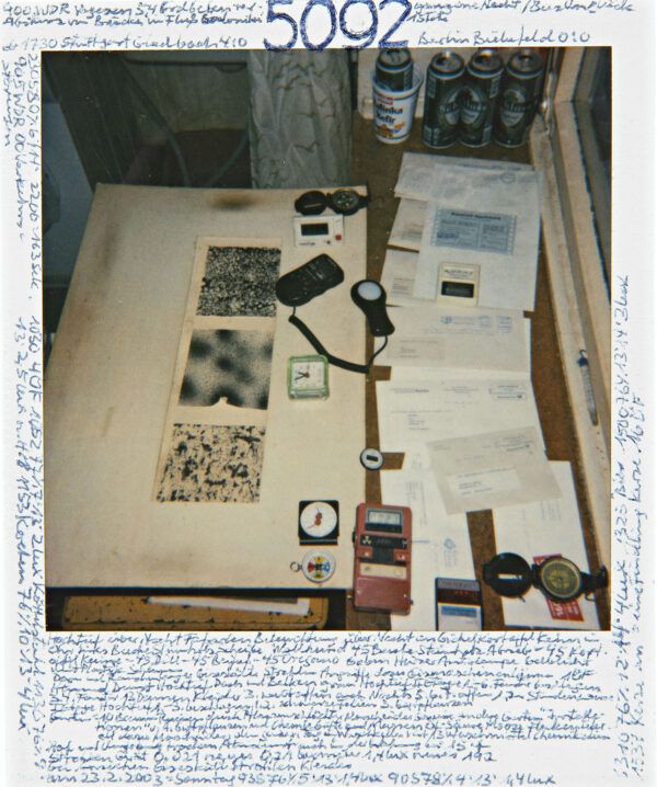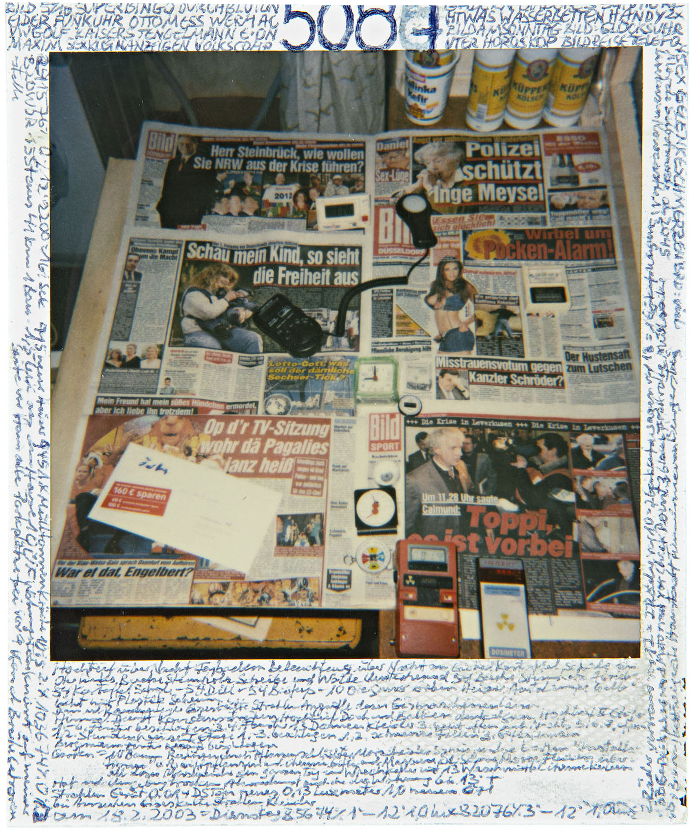Horst Ademeit spent the last 40 years of his life to documenting the existence of “cold rays,” recording their detrimental effect on himself and his surroundings. To this end, he took thousands of Polaroid and (later) digital photographs, which he numbered and dated and used as a record of his everyday observations. On the margins of the photographs, he wrote in nearly illegible writing the smells, sounds and atmosphere that surrounded him the moment he pressed the shutter release. His table was piled with magazines (mostly BILD-Zeitung), letters and food; using a Geiger counter, light meter and other measuring devices, he calculated the intensity of the cold rays. He tried to discover who was responsible for all of his and the world’s problems. “It is just a question of time before I catch them red-handed,” he claimed. He used a lathe to make hundreds of little balls, which he carried with him in order to disrupt the cold rays. His daily routine was fully determined by his inventorying and by the logical rules of his system.