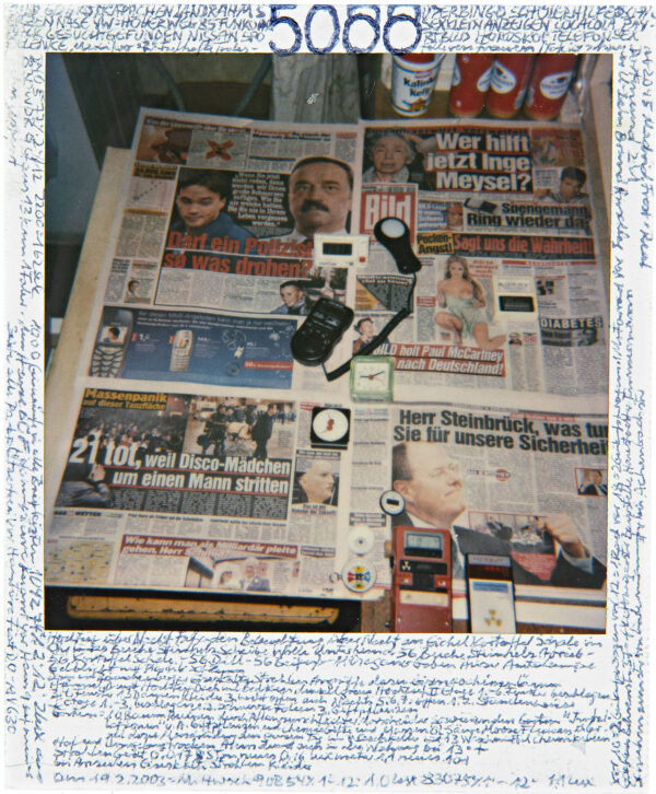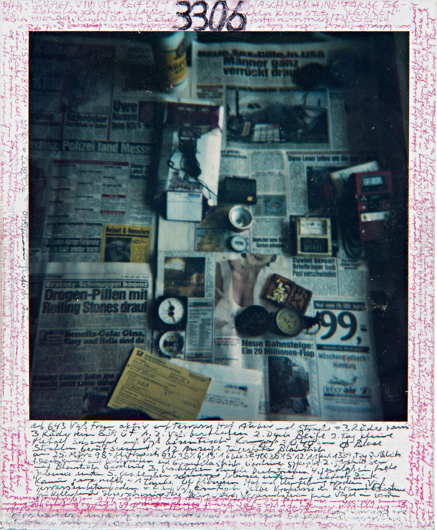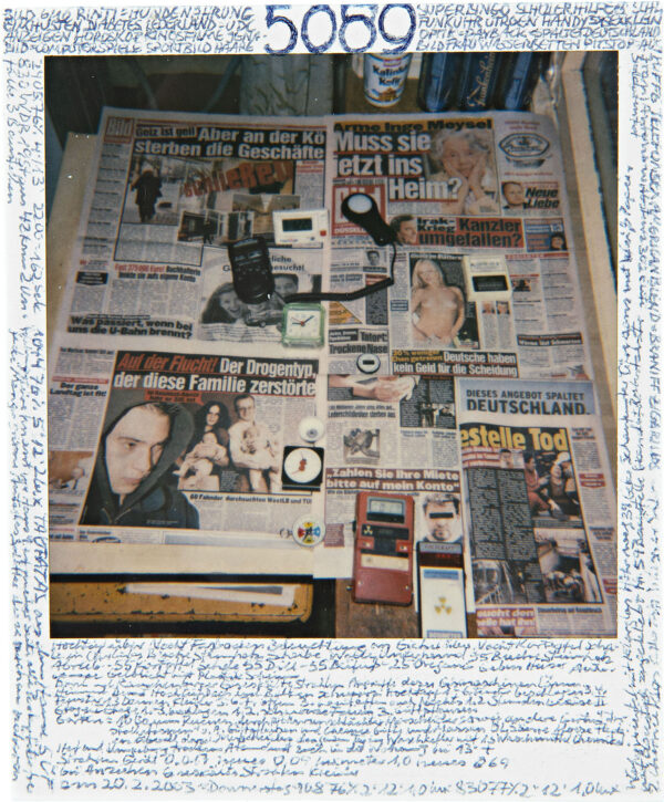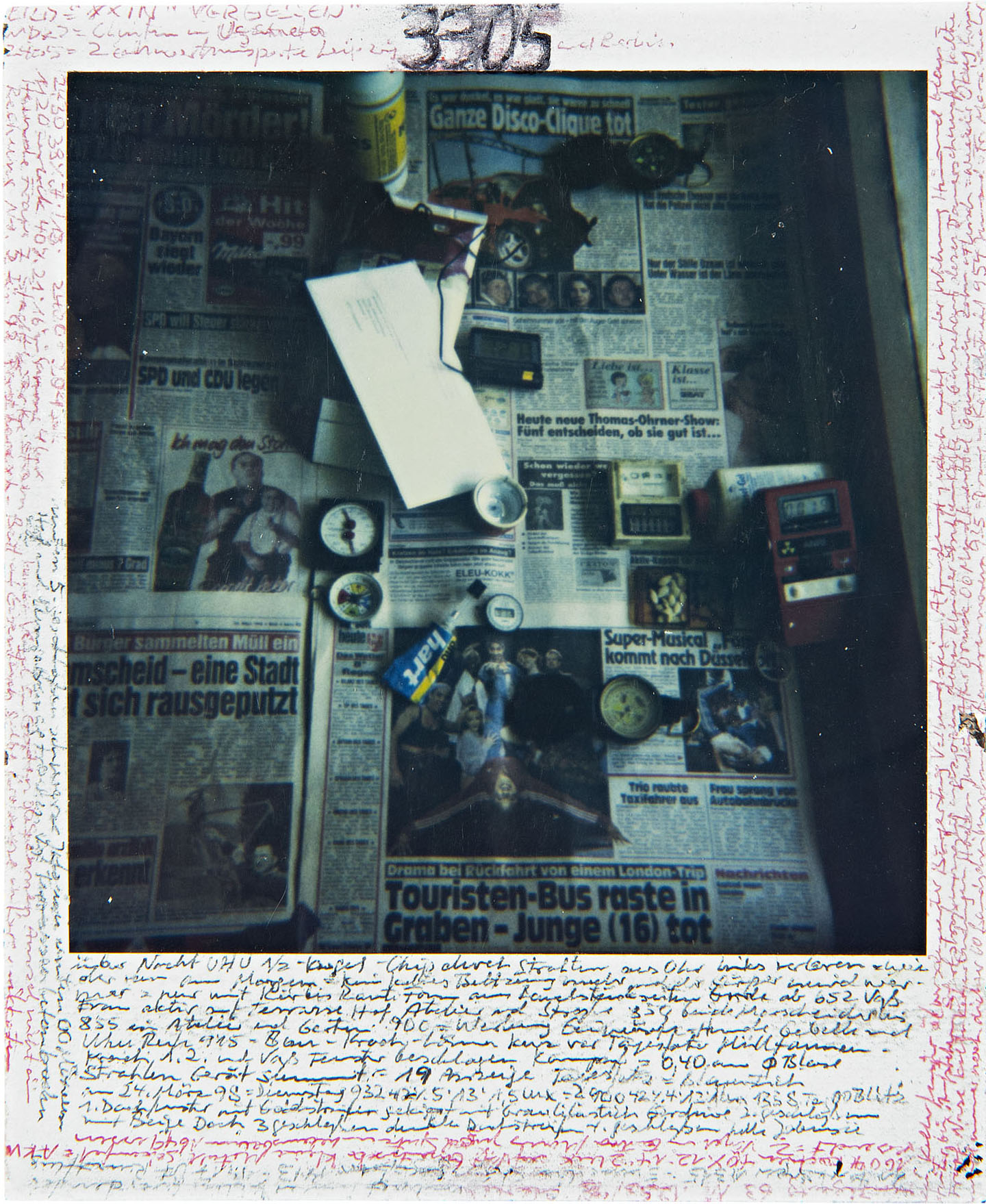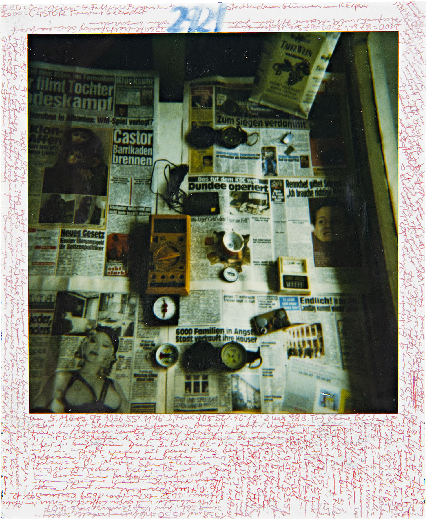Horst Ademeit spent the last 40 years of his life to documenting the existence of “cold rays,” recording their detrimental effect on himself and his surroundings. To this end, he took thousands of Polaroid and (later) digital photographs, which he numbered and dated and used as a record of his everyday observations. On the margins of the photographs, he wrote in nearly illegible writing the smells, sounds and atmosphere that surrounded him the moment he pressed the shutter release. His table was piled with magazines (mostly BILD-Zeitung), letters and food; using a Geiger counter, light meter and other measuring devices, he calculated the intensity of the cold rays. He tried to discover who was responsible for all of his and the world’s problems. “It is just a question of time before I catch them red-handed,” he claimed. He used a lathe to make hundreds of little balls, which he carried with him in order to disrupt the cold rays. His daily routine was fully determined by his inventorying and by the logical rules of his system.