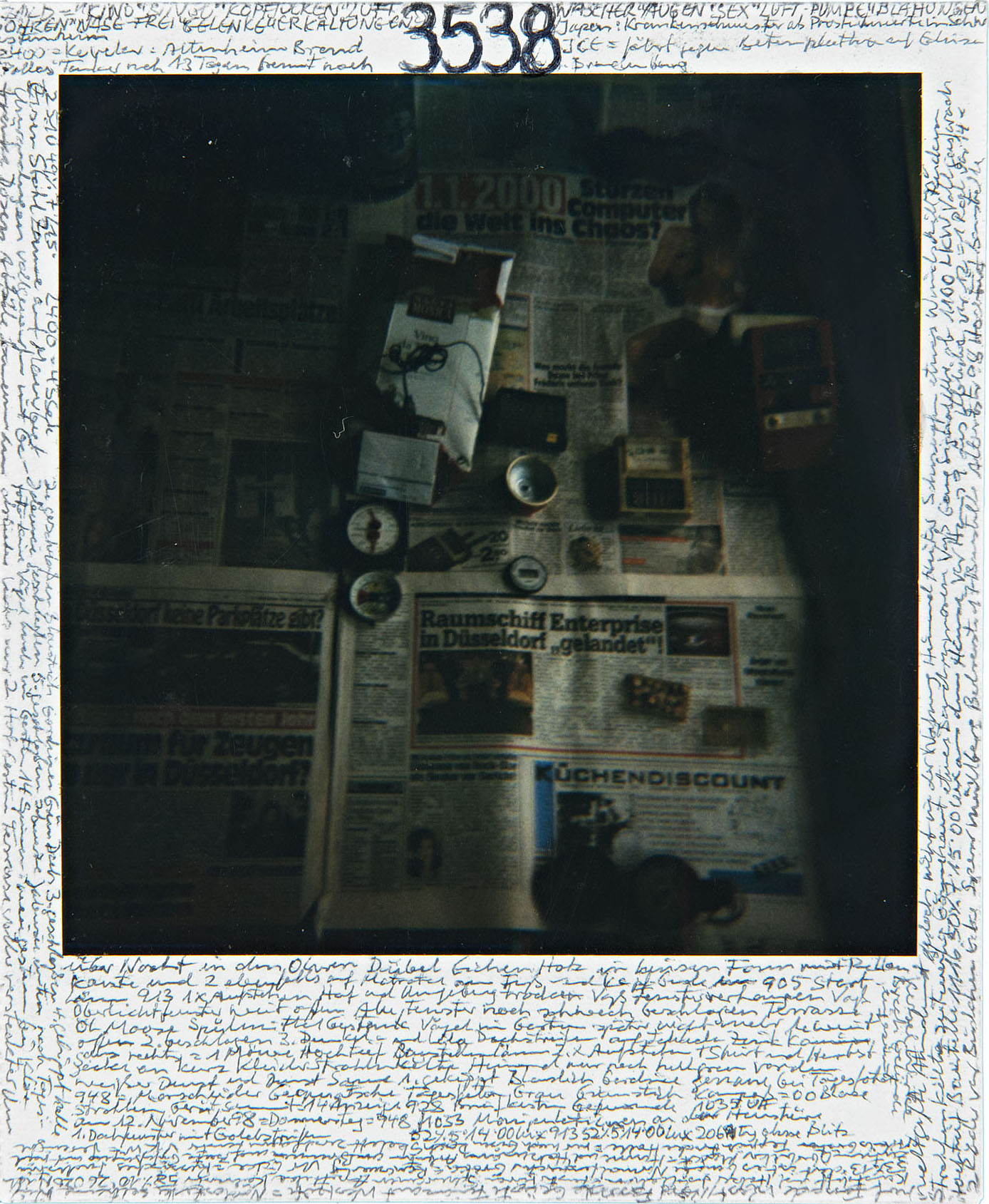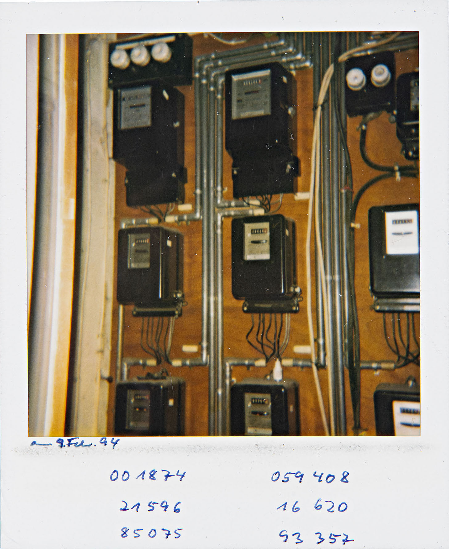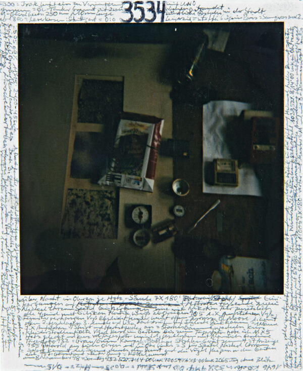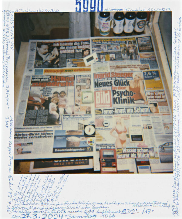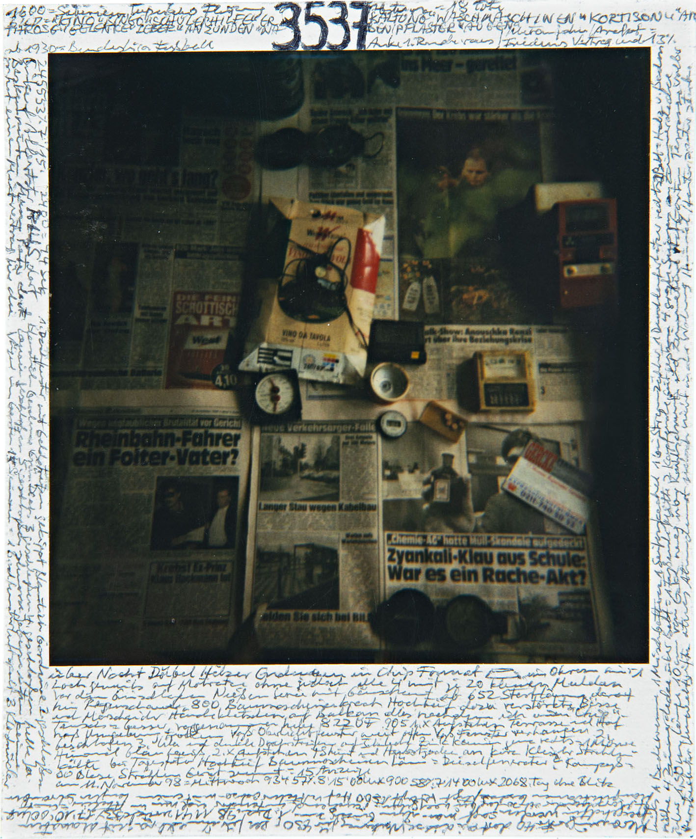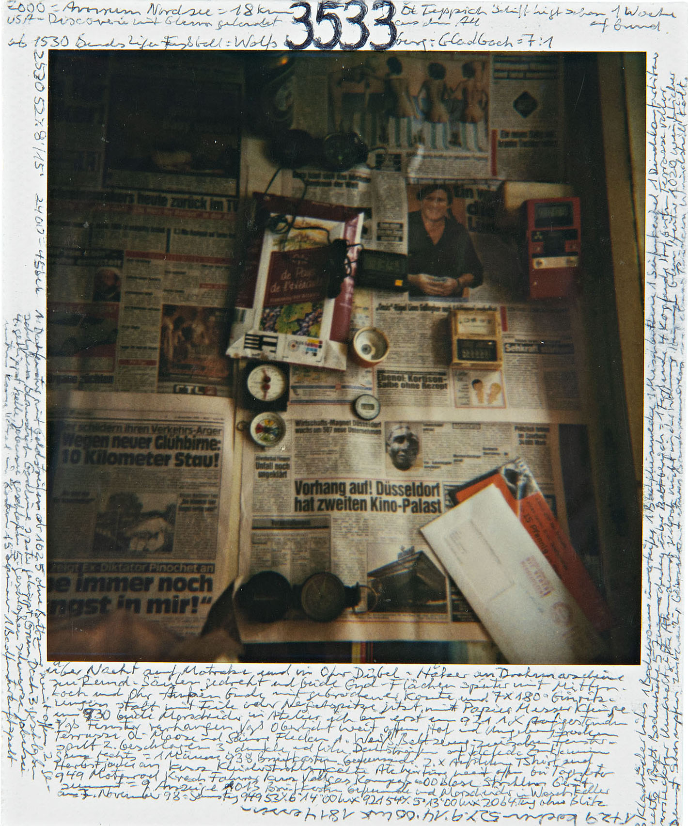 Horst Ademeit spent the last 40 years of his life to documenting the existence of “cold rays,” recording their detrimental effect on himself and his surroundings. To this end, he took thousands of Polaroid and (later) digital photographs, which he numbered and dated and used as a record of his everyday observations. On the margins of the photographs, he wrote in nearly illegible writing the smells, sounds and atmosphere that surrounded him the moment he pressed the shutter release. His table was piled with magazines (mostly BILD-Zeitung), letters and food; using a Geiger counter, light meter and other measuring devices, he calculated the intensity of the cold rays. He tried to discover who was responsible for all of his and the world’s problems. “It is just a question of time before I catch them red-handed,” he claimed. He used a lathe to make hundreds of little balls, which he carried with him in order to disrupt the cold rays. His daily routine was fully determined by his inventorying and by the logical rules of his system.