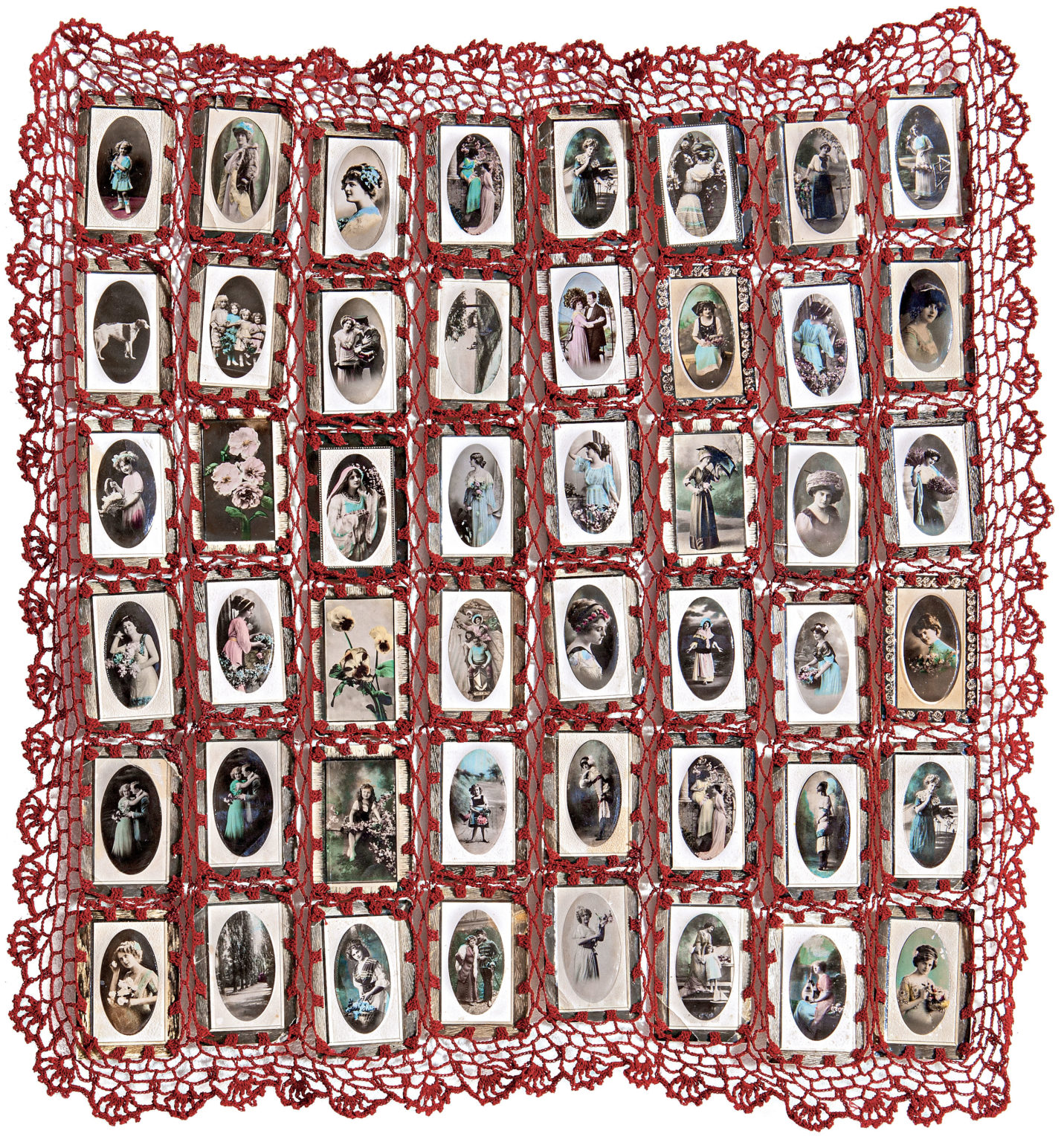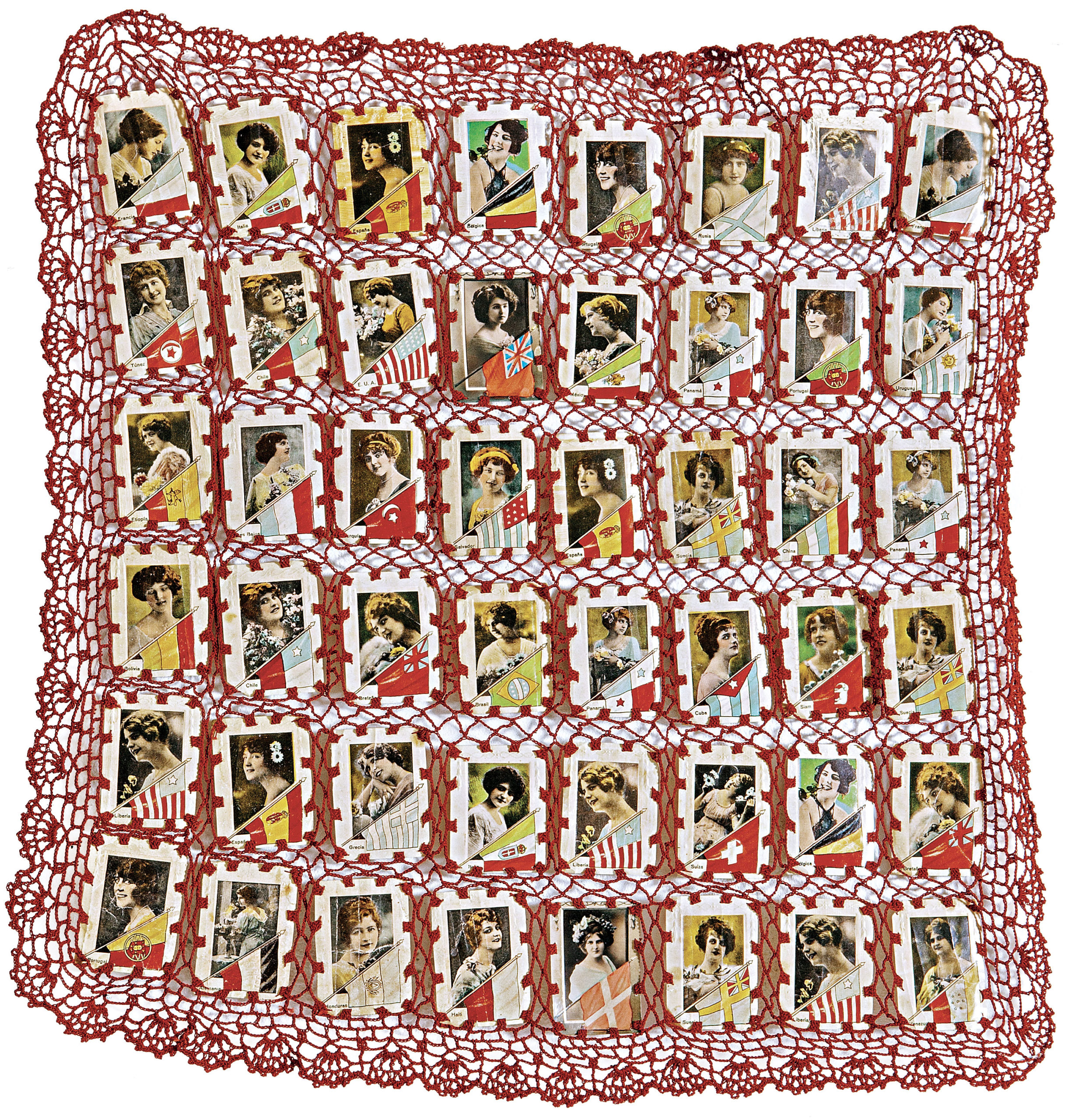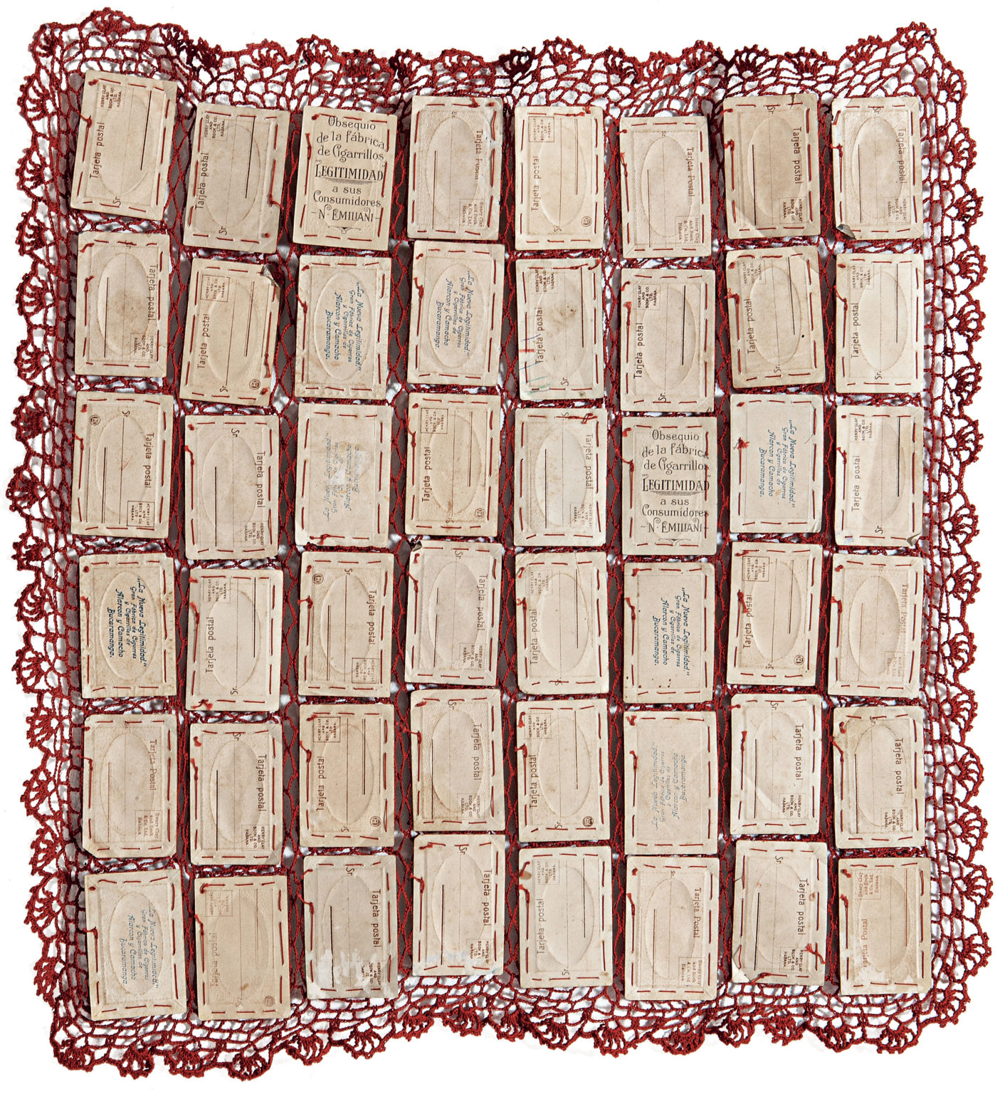 Ces deux œuvres seraient d’origine colombienne, c’est la seule information connue à leur sujet. Elles se composent, pour l’une, de cartes publicitaires à l’effigie de femmes le plus souvent, et pour l’autre également de portraits féminins mais accompagnés d’un drapeau, imprimés par une marque de cigarillos dans un but promotionnel. Le style des photographies, reliées entre elles par la technique du crochet, ne permet pas de fournir une datation fiable. Au regard de la précision et de la délicatesse du travail ainsi que du temps qu’on imagine nécessaire à leur réalisation, on peut s’interroger sur ce qui a motivé leur auteur, car la fragilité du papier en empêche toute utilisation ménagère (comme par exemple un napperon).