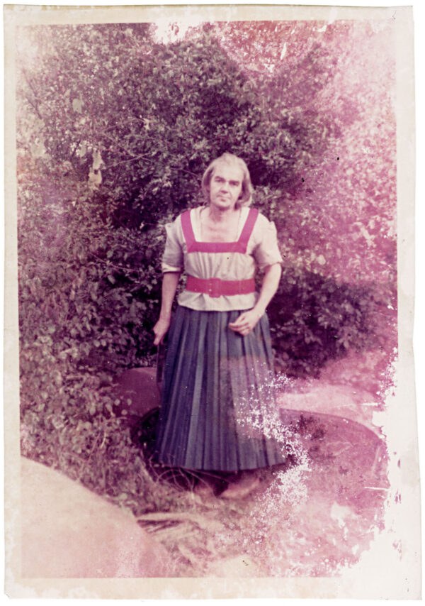 Marcel Bascoulard’s family history was marked by upheaval after his mother murdered his father when Marcel was nineteen years old. The young adult, who dreamed of becoming a train engineer, soon found himself living on the streets. He moved to Bourges, where he lived in sheds, mostly in the neighborhood of Avaricum. Despite this precarious situation and with the meager means at his disposal until his death, which was a violent one (he also would be murdered), he developed a prolific and multidisciplinary art practice that involved performance, photography, poetry, and drawing. The drawings that he produced in his youth demonstrated the breadth of his photographic memory. In a detail-rich realist style, he drew the town’s prestigious monuments and deserted nooks from vertiginous perspectives. It is unsurprising, of course, that Bascoulard—a man who had no social attachments—photographed steam locomotives and faithfully reproduced maps. Bascoulard became an antisocial and eccentric local character, both admired and outcast. He sometimes went out in broad daylight attired as a woman, wearing dresses that he made or ordered to measure. In a letter, he confided, “If I sometimes walk around dressed like a woman, it’s because I find this apparel more aesthetic. For the purpose of art, when I put on women’s clothing, I take my camera with me and have people I know take snapshots of me.” In the 1940s, he had his photograph taken by the Morlet photography studio, near where he lived. In these small-format photographs with notched edges, his expression is always the same: a face slightly tilted without makeup. The photographs show him as a young woman (his waist cinched and his skirt swelled by a petticoat), an elegant middle-class lady, and a housekeeper wearing an apron, among other characters. In one photograph, he appears as a samurai warrior. The images portray Bascoulard changing over the years as his body weakens and his hair gradually turns white. Strangely, he is holding a mirror in most of his poses. Bascoulard knew how to keep up the mystery. He participated in the creation of his own romantic and tragic legend, fed by identification with a mother figure and rejection of the domestic sphere.