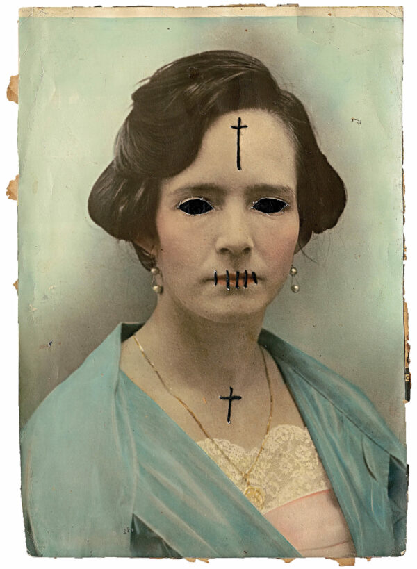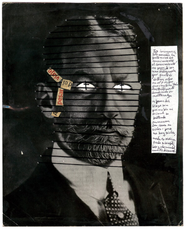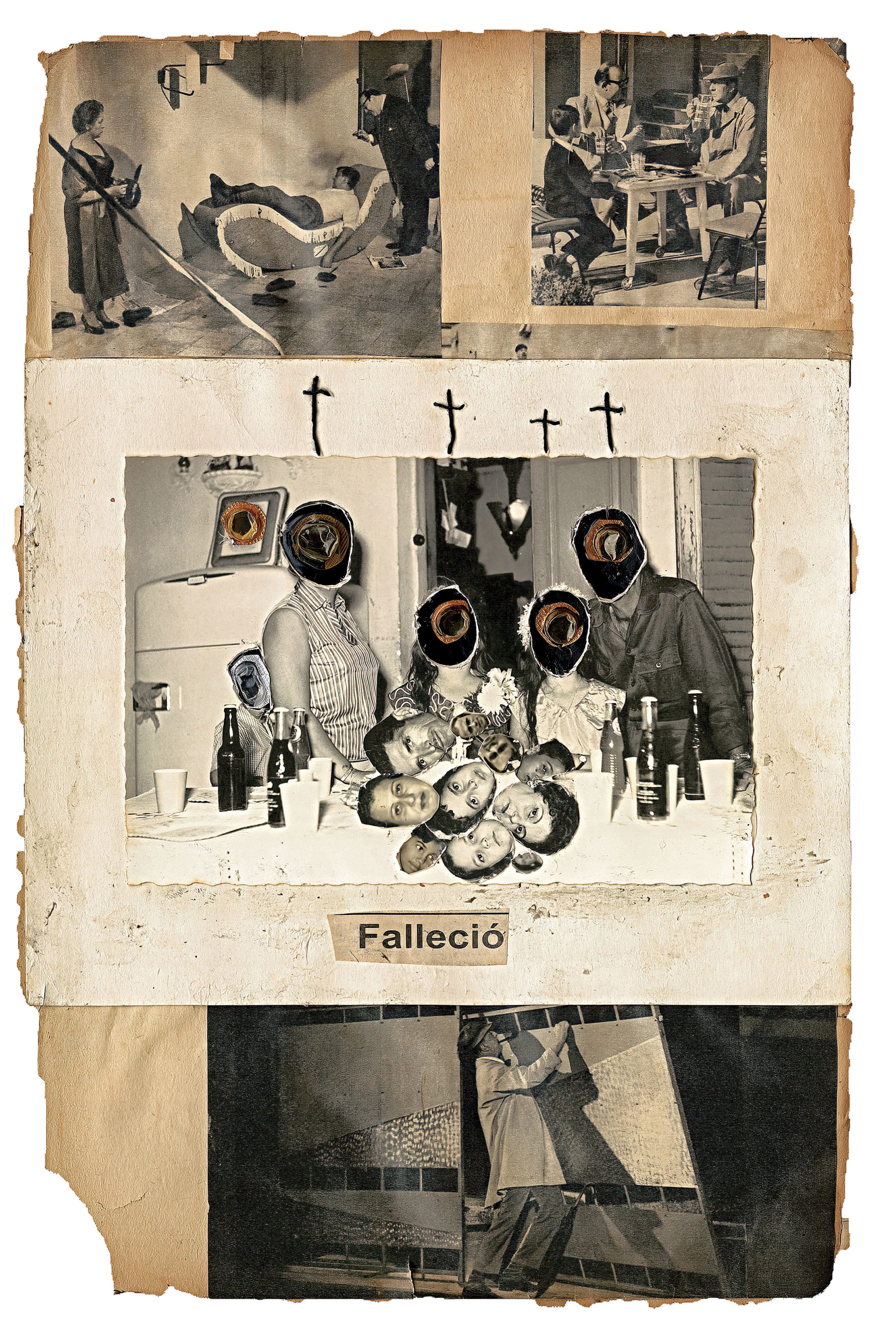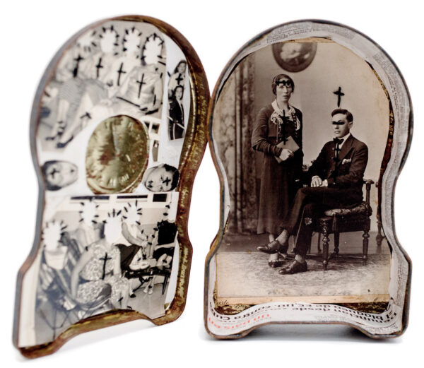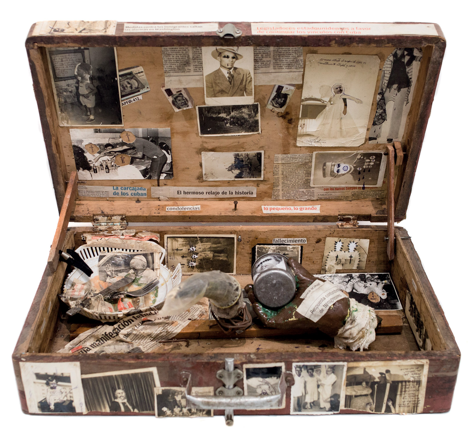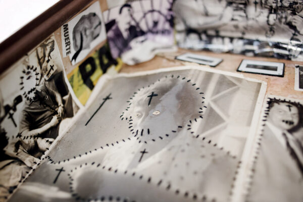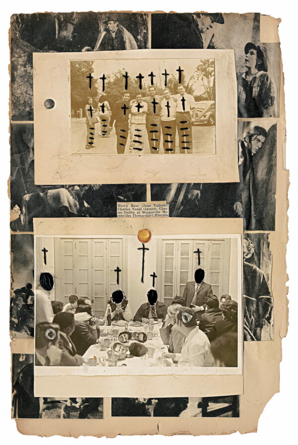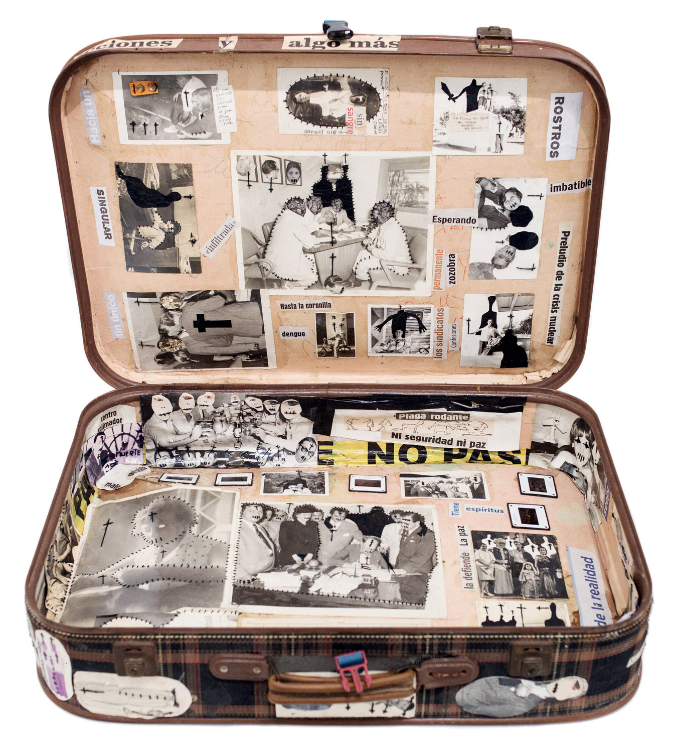 Born in Havana Jorge Alberto Cadi, known as “El Buzo” — the diver — has no other family than his brother, who like him has schizophrenia. He tirelessly walks the streets of the city in search of thrown away objects. For more than twenty years, he has been collecting suitcases, boxes, photographs and newspaper clippings whose path he has crossed, literally and figuratively. Not to rehabilitate them, but because he detects in these objects a strong potential for extrapolation, wonderful narrative possibilities. The photographs remain his material of choice, as for the objects, he takes over all of their surfaces, proceeding as much by hybridization as by concretion, gluing, cutting, sewing bits together. Thus, touching family scenes are transformed into grotesque, even satanic images, where the characters are deprived of their faces or characterized by devilish features. The suitcase — a symbol, in Cuba, of heartbreak, wandering, separations — becomes, for him, the place of possibilities and unexpected reunions. “When you close the suitcase, you bring together people who have never seen each other. They go back to travel… Sometimes in another dimension.” But it is also about what has been sewn together and torn apart, given a new possibility to continue. “We are a bit stitched up by time.” he confides.