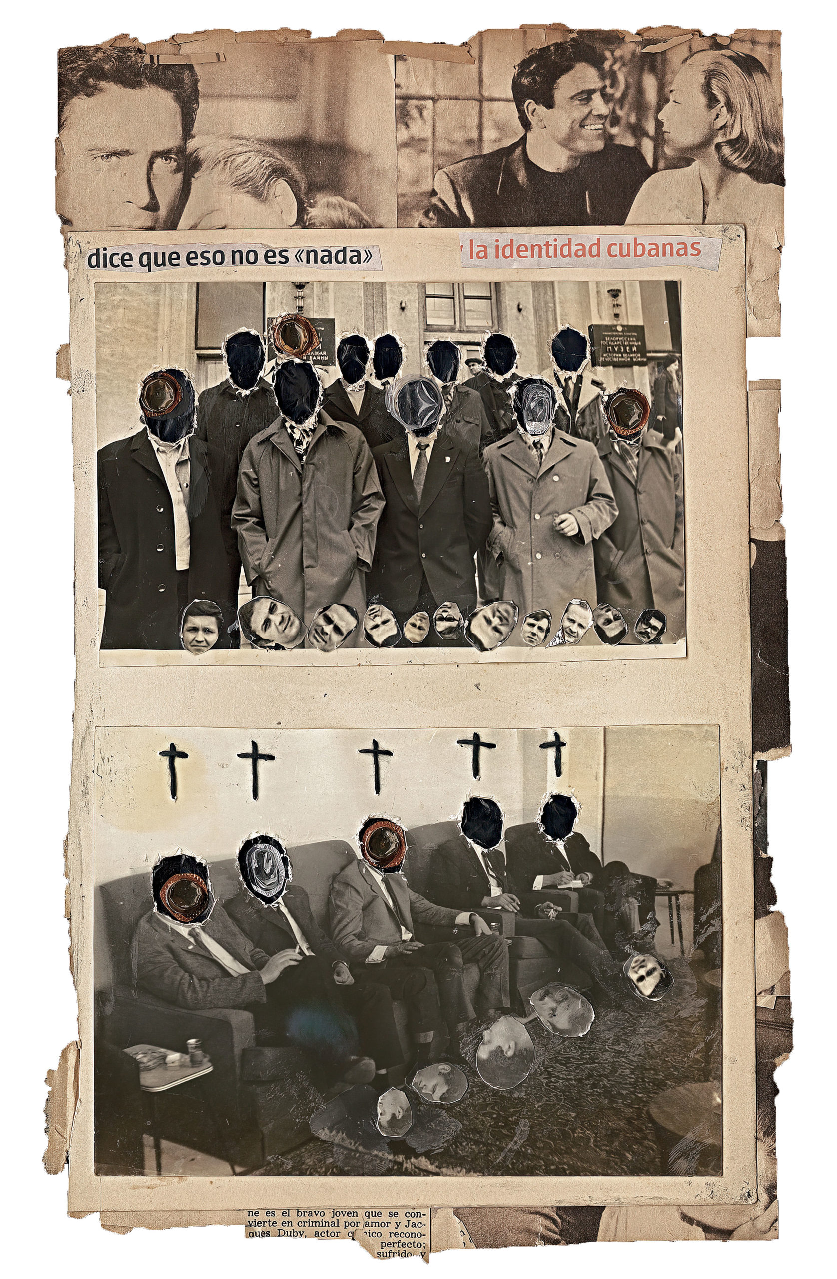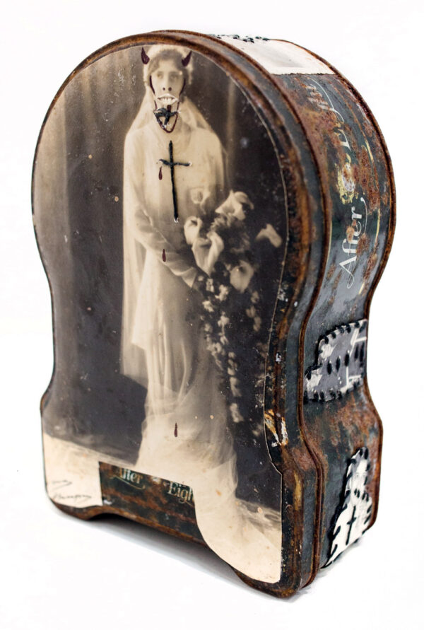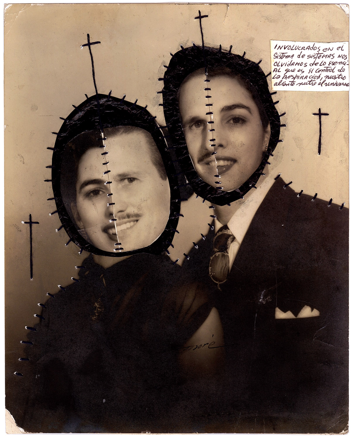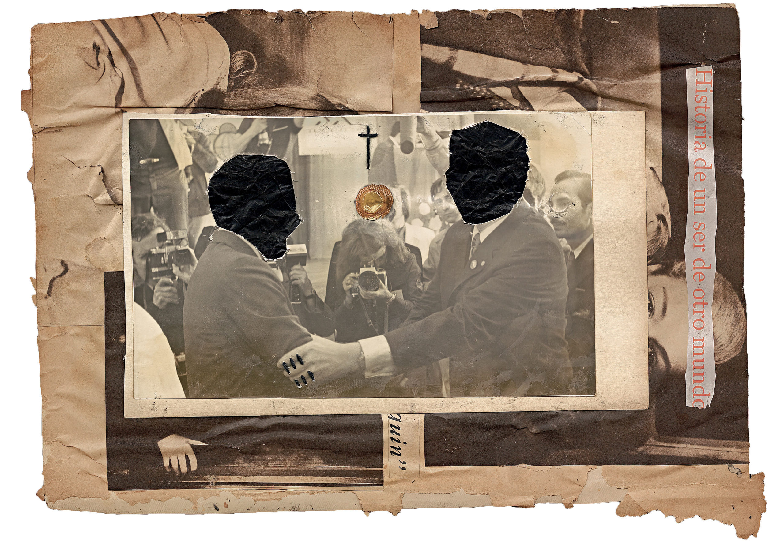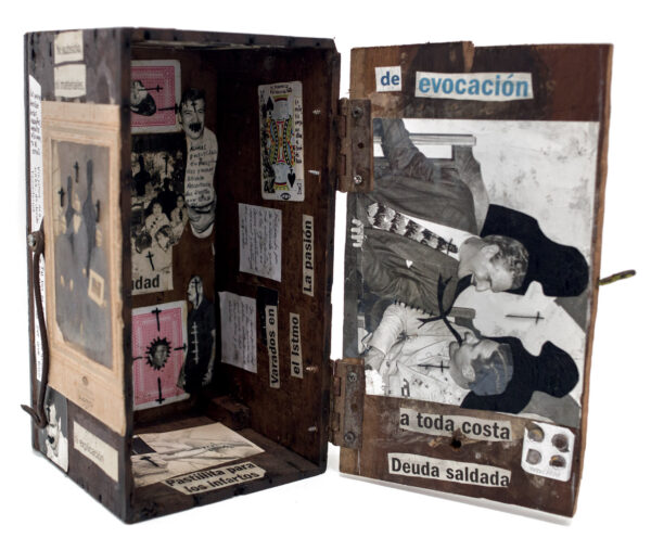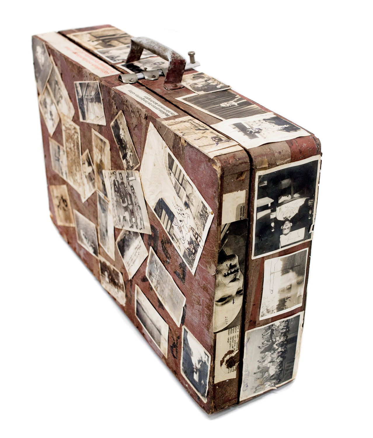 Born in Havana Jorge Alberto Cadi, known as “El Buzo” — the diver — has no other family than his brother, who like him has schizophrenia. He tirelessly walks the streets of the city in search of thrown away objects. For more than twenty years, he has been collecting suitcases, boxes, photographs and newspaper clippings whose path he has crossed, literally and figuratively. Not to rehabilitate them, but because he detects in these objects a strong potential for extrapolation, wonderful narrative possibilities. The photographs remain his material of choice, as for the objects, he takes over all of their surfaces, proceeding as much by hybridization as by concretion, gluing, cutting, sewing bits together. Thus, touching family scenes are transformed into grotesque, even satanic images, where the characters are deprived of their faces or characterized by devilish features. The suitcase — a symbol, in Cuba, of heartbreak, wandering, separations — becomes, for him, the place of possibilities and unexpected reunions. “When you close the suitcase, you bring together people who have never seen each other. They go back to travel… Sometimes in another dimension.” But it is also about what has been sewn together and torn apart, given a new possibility to continue. “We are a bit stitched up by time.” he confides.
