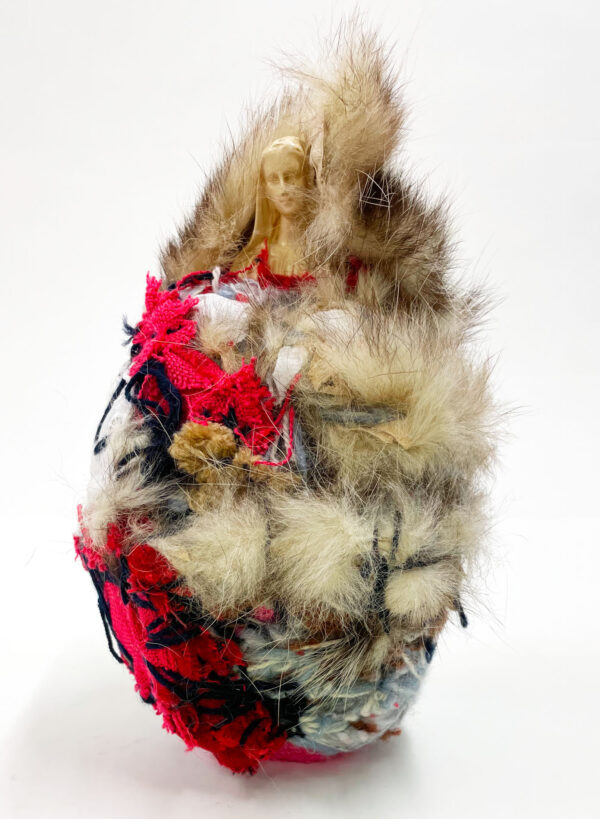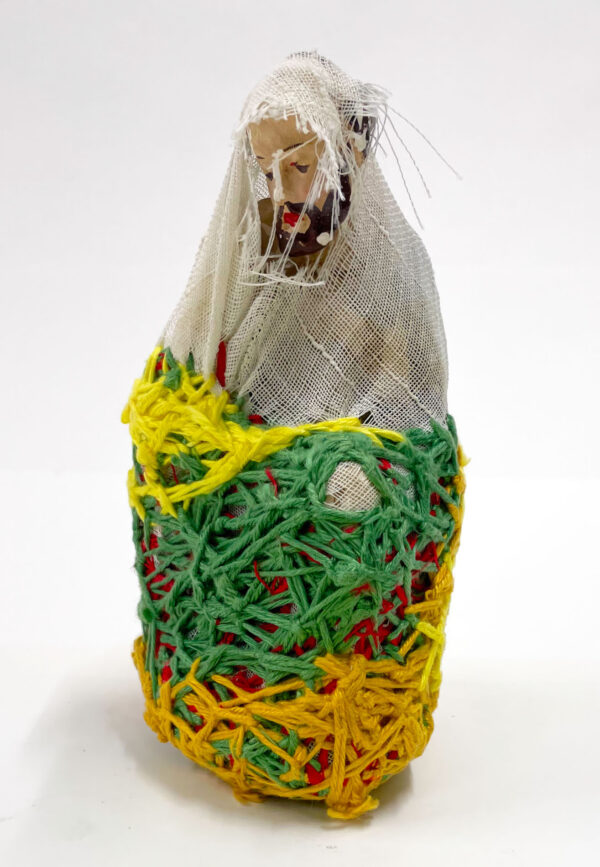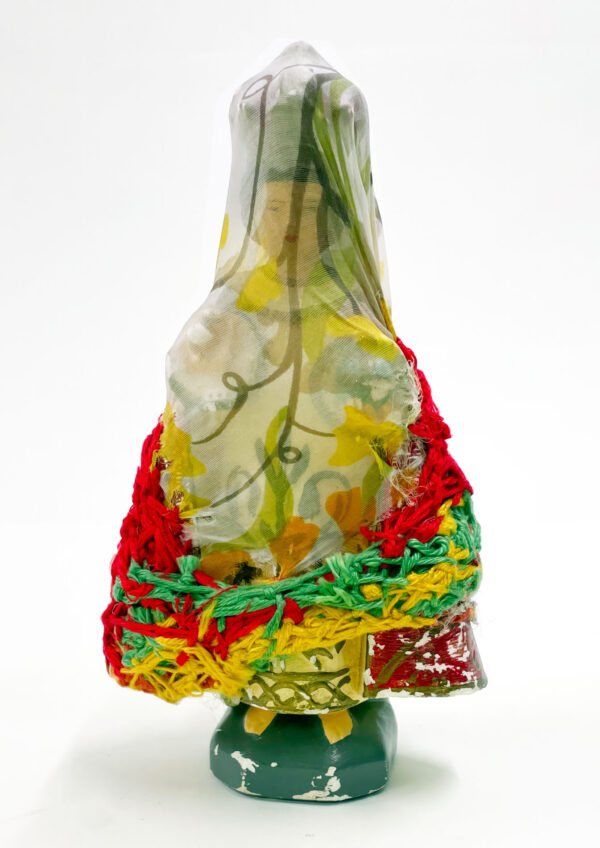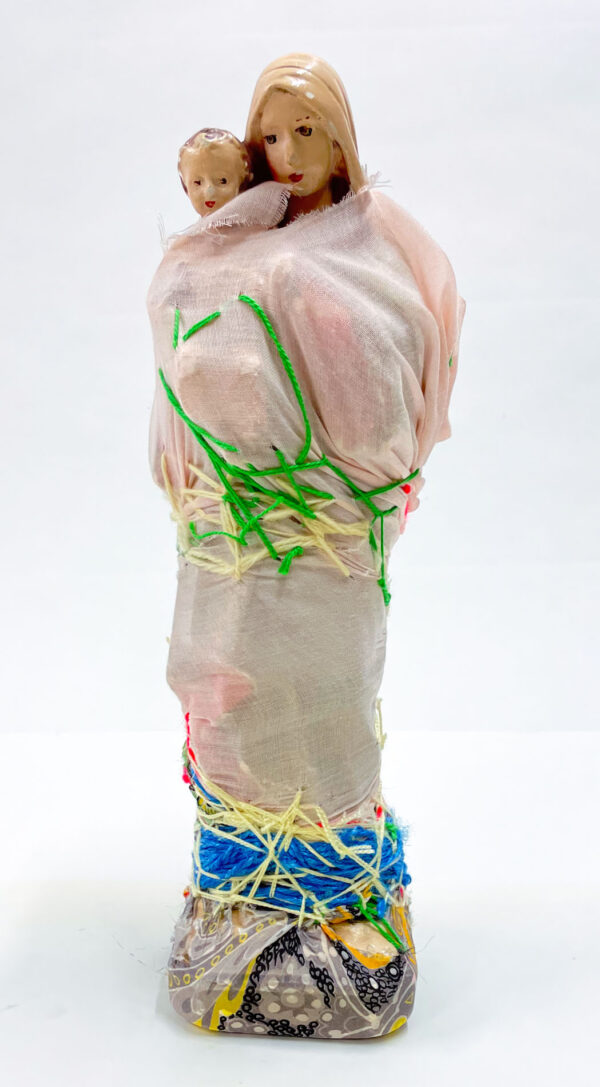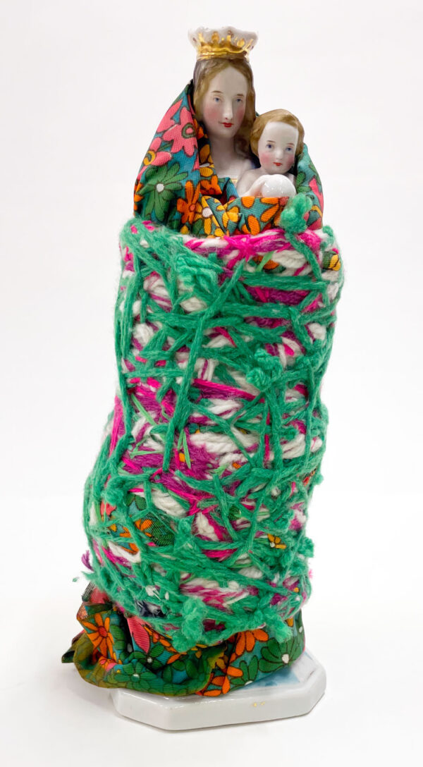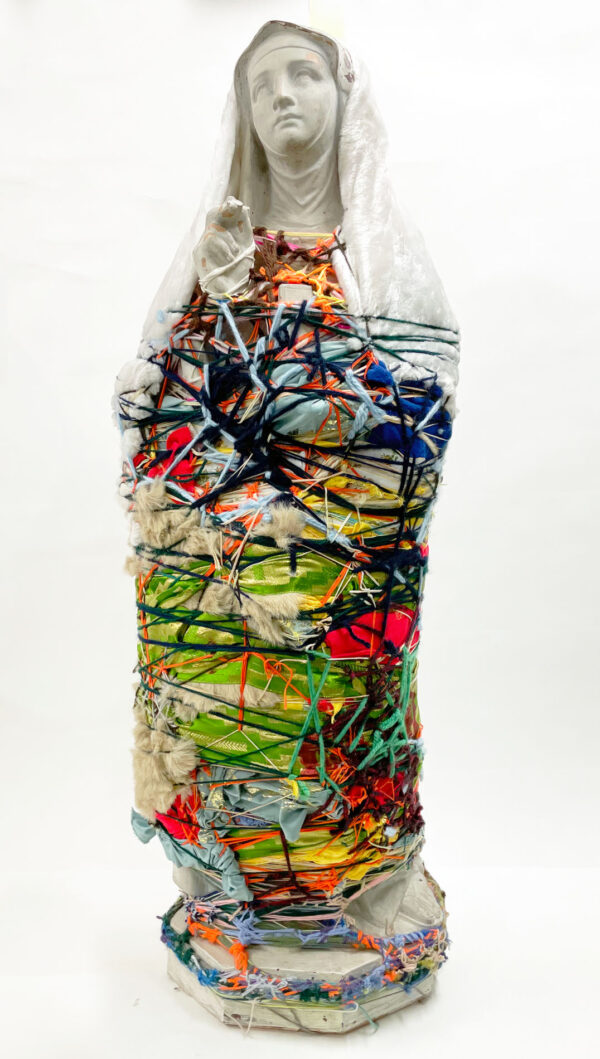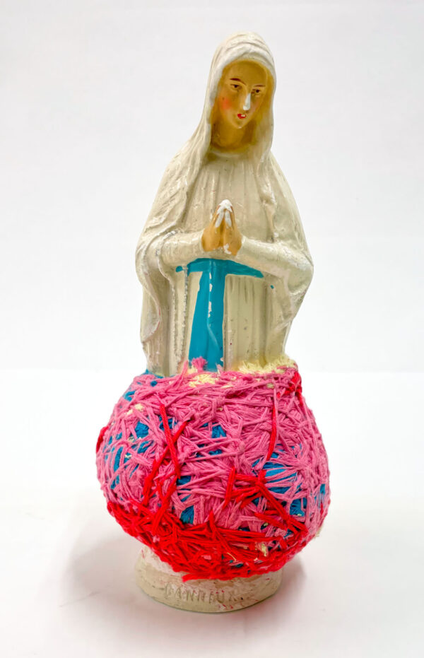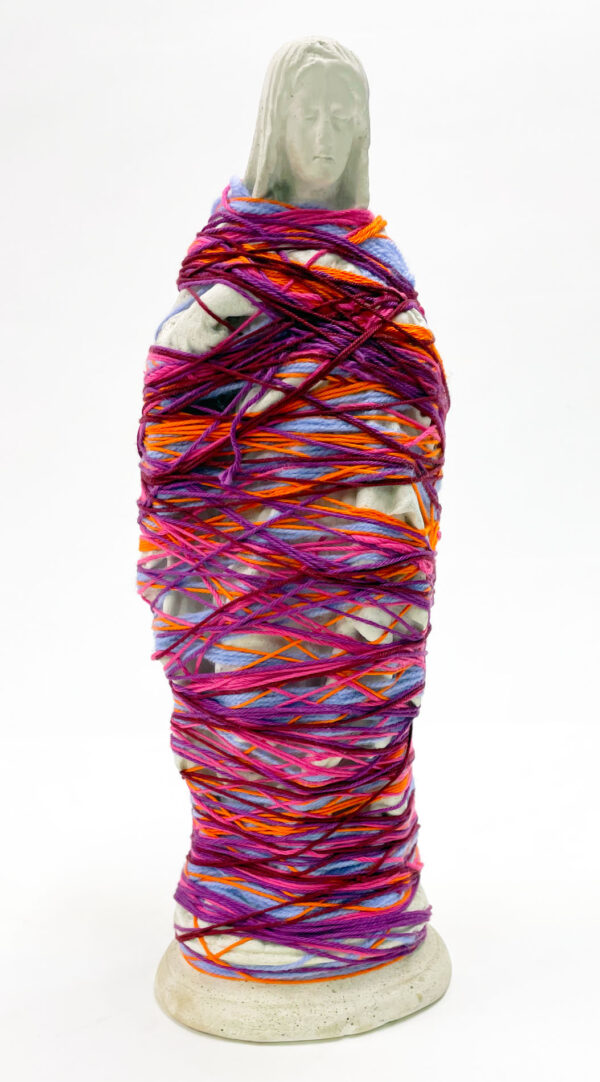 It was with pastel drawing that Laura Delvaux began her artistic activity at La « S » Grand Atelier in Vielsalm. Her trajectory took a decisive turn in 2008 when she began exploring new forms of expression through the textile medium. After creating dolls sewn from various pieces of fabric, she developed her work toward more abstract constructions, made from small decorative objects, toys, or soft toys, which she methodically wrapped with colored wool threads until they partially or completely disappeared beneath the fibrous layers. For the collective project Ave Luïa, she applied this technique to plaster Virgins.