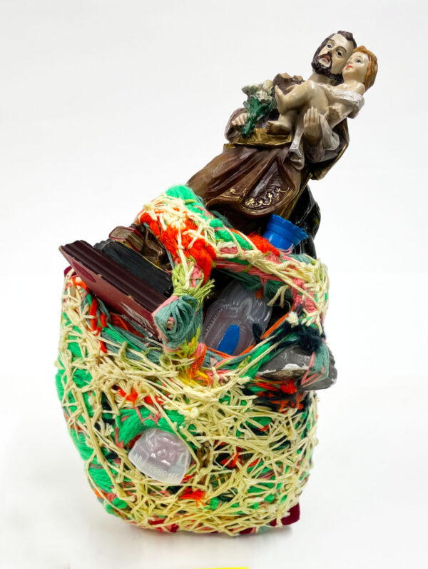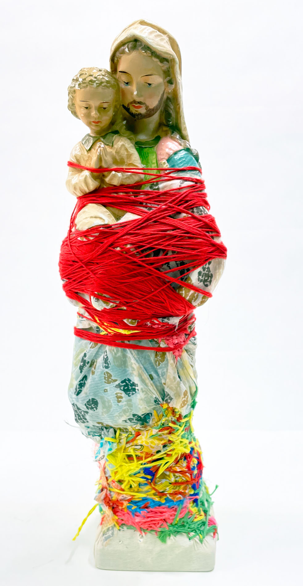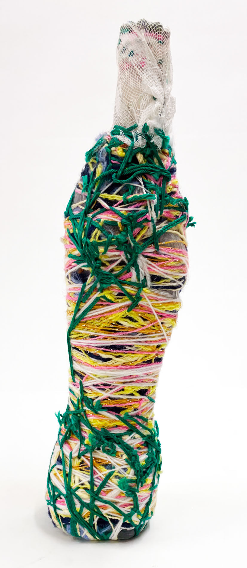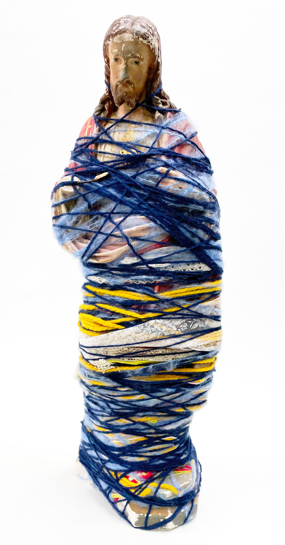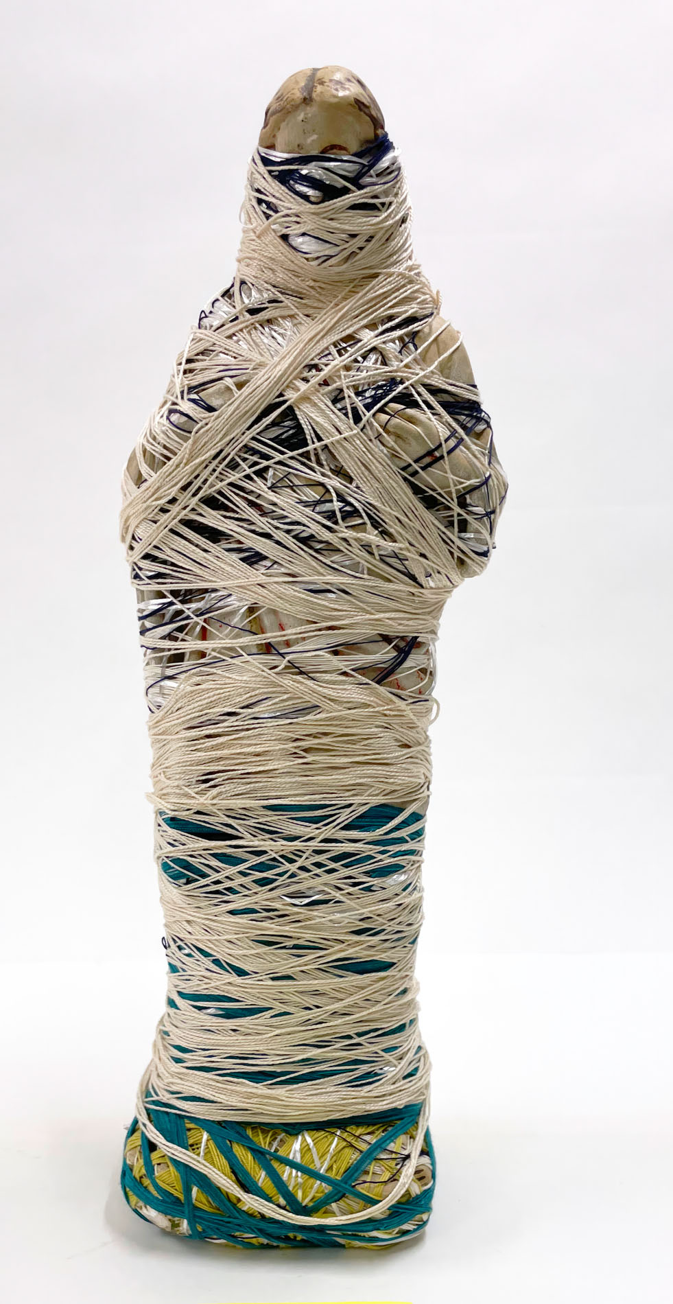 It was with pastel drawing that Laura Delvaux began her artistic activity at La « S » Grand Atelier in Vielsalm. Her trajectory took a decisive turn in 2008 when she began exploring new forms of expression through the textile medium. After creating dolls sewn from various pieces of fabric, she developed her work toward more abstract constructions, made from small decorative objects, toys, or soft toys, which she methodically wrapped with colored wool threads until they partially or completely disappeared beneath the fibrous layers. For the collective project Ave Luïa, she applied this technique to plaster Virgins.