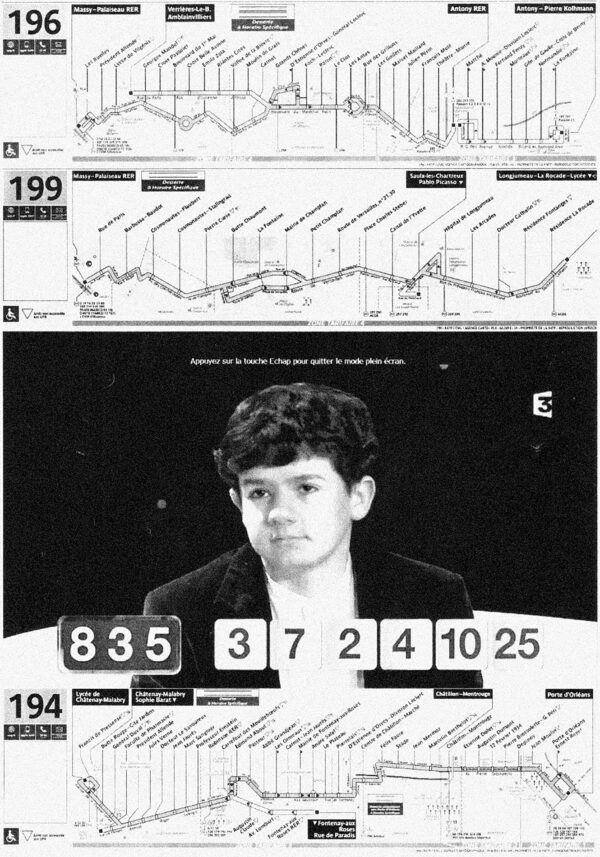 Yohann Goetzmann constantly carries with him a folder filled with sheets printed with collages of screenshots, game shows, numbers and letters, images related to diagrams, railway, metro and bus maps, and so on. But also starlets and television presenters. Yohann Goetzmann is inexhaustible when it comes to the sources of his images. He developed his collage technique as a self-taught artist; recording his compositions matters little to him, as for him the final goal is the printed image on paper. He also performs in Astéréotypie, a spoken word project that originated in his former special education institute. Passionate about everything related to series, routes, and networks, he seems to find in them a form of reassurance. He was accommodated in various institutions before joining La Pommeraie in Belgium. When he was told that the center did not provide internet access for residents, one can imagine his distress. He was then offered colored pencils as a substitute for his tool of passion. Brut Pop met Yohann Goetzmann in 2014 for the documentary it was filming at the time for France Télévisions: “Musique Brute, handicap et contre-culture.” Brut Pop then began to present his work in various venues and events.