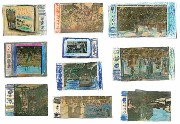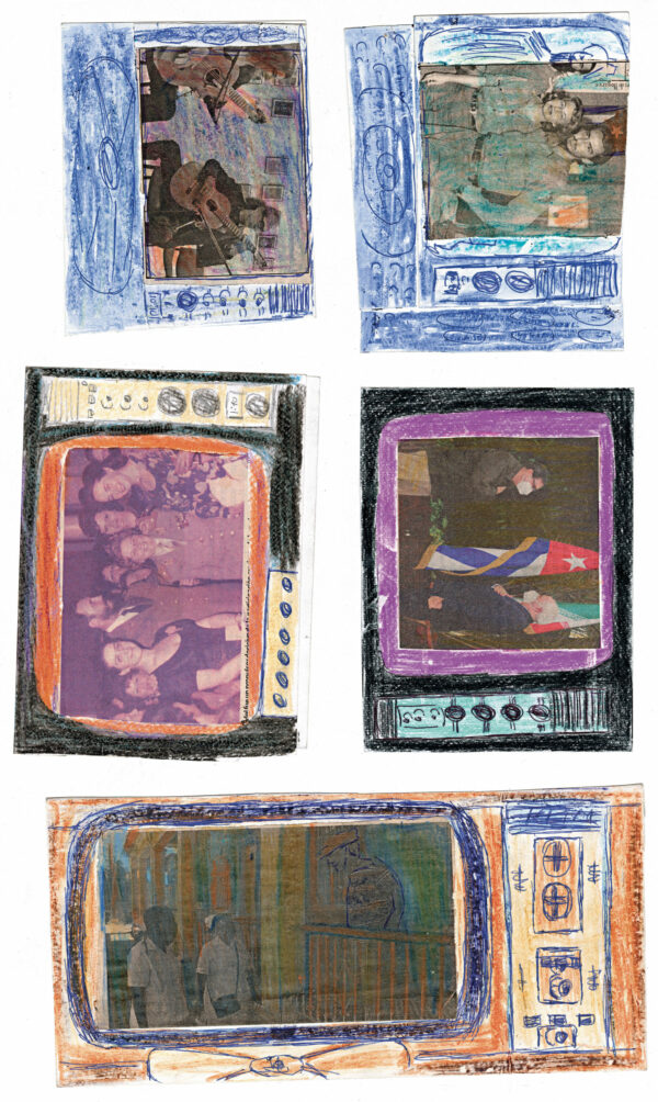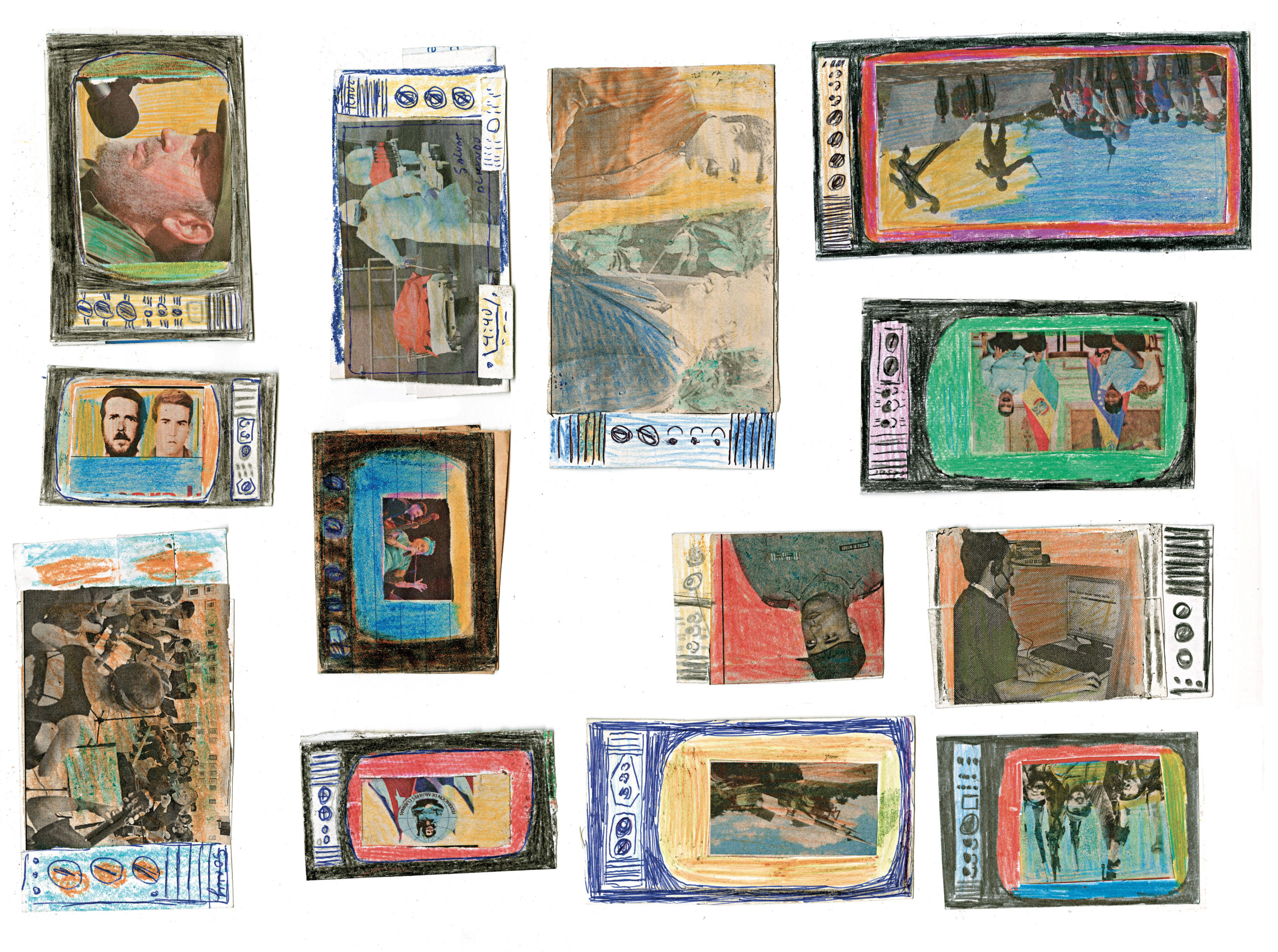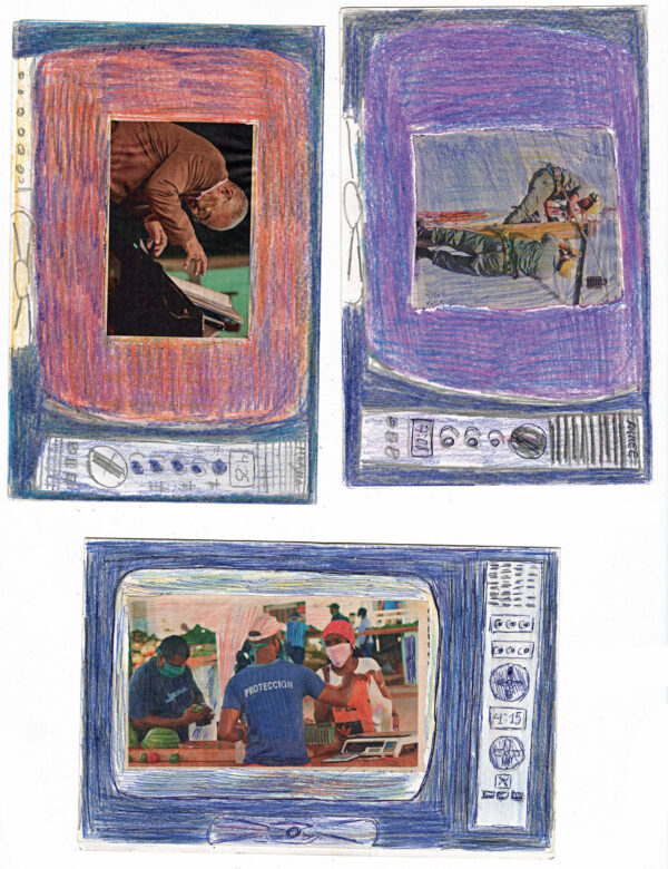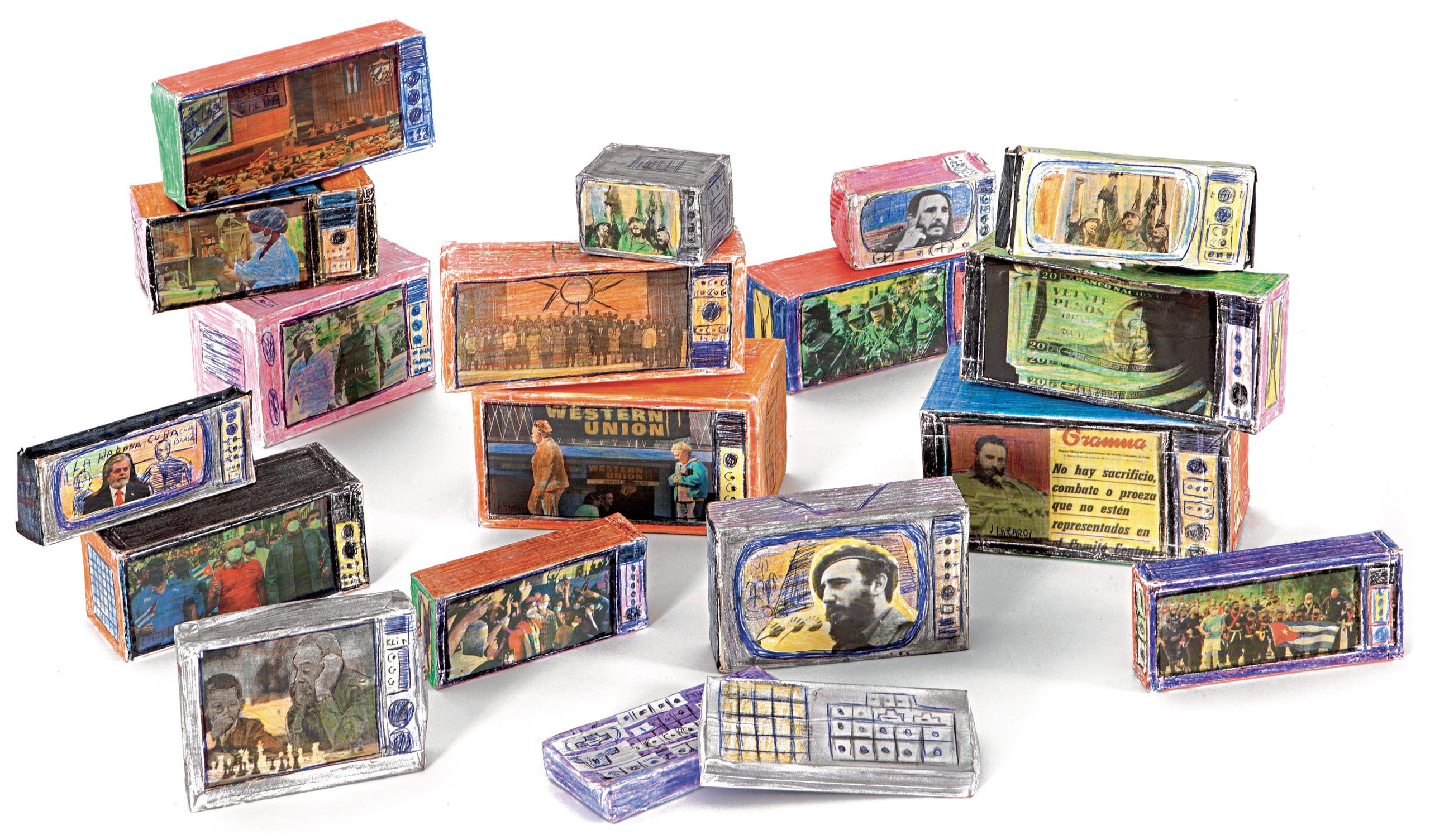 Depuis l’enfance, Martínez Durán découpe ces images d’actualité et de propagande pour les insérer dans des téléviseurs en carton qu’il fabrique : ses collages deviennent les images diffusées à l’écran. Deux temporalités s’y superposent, montrant l’écart entre le quotidien et des photos souvent dépassées.