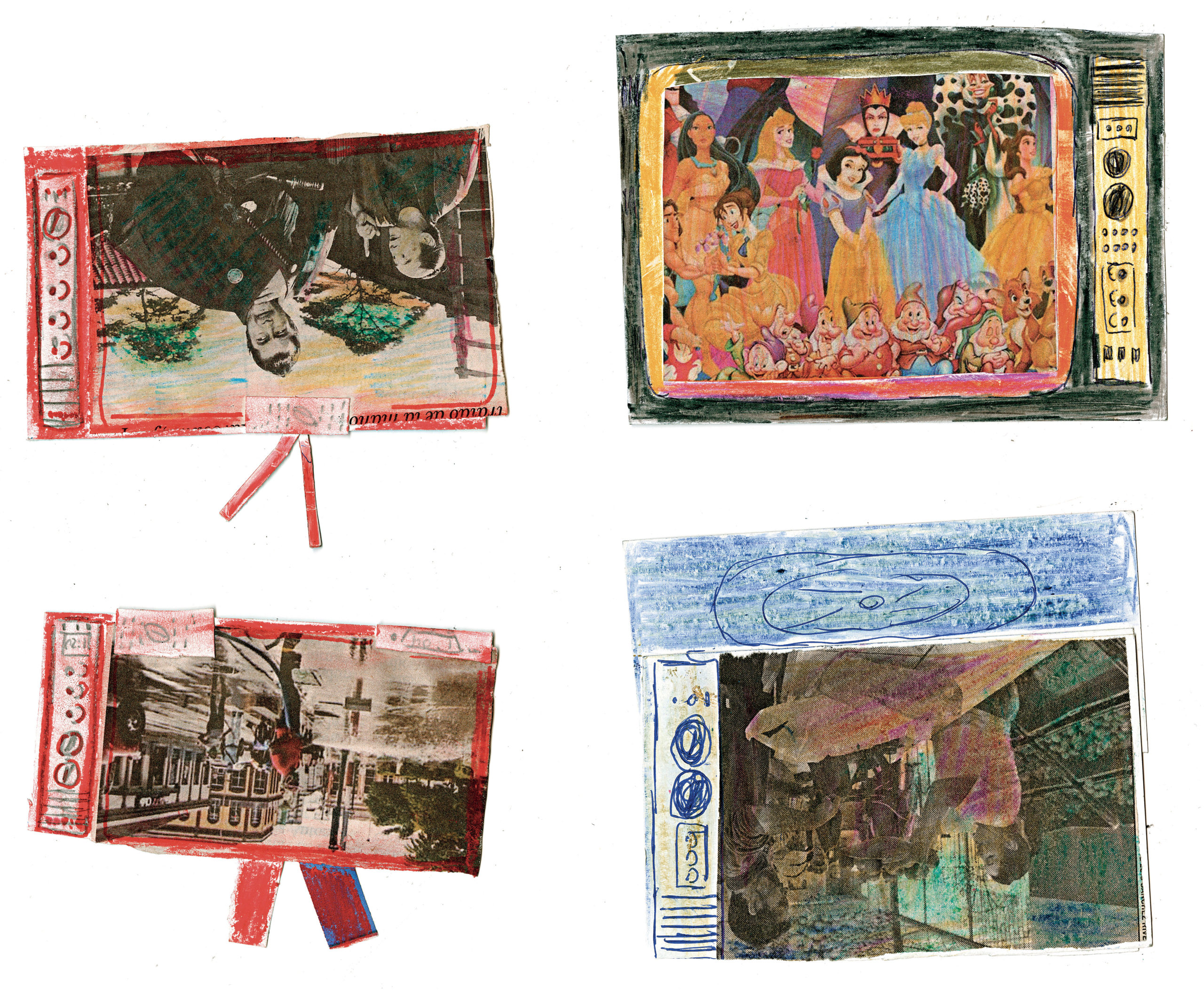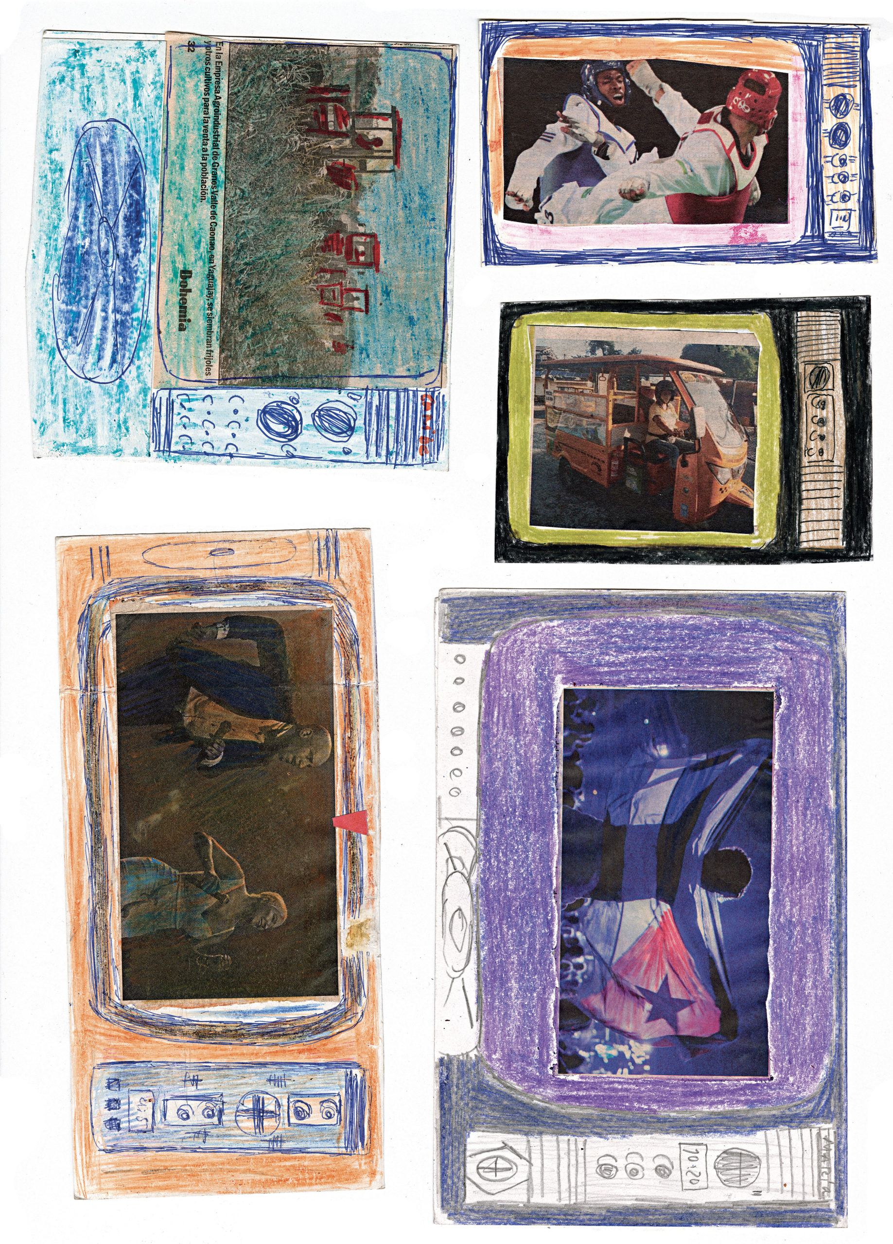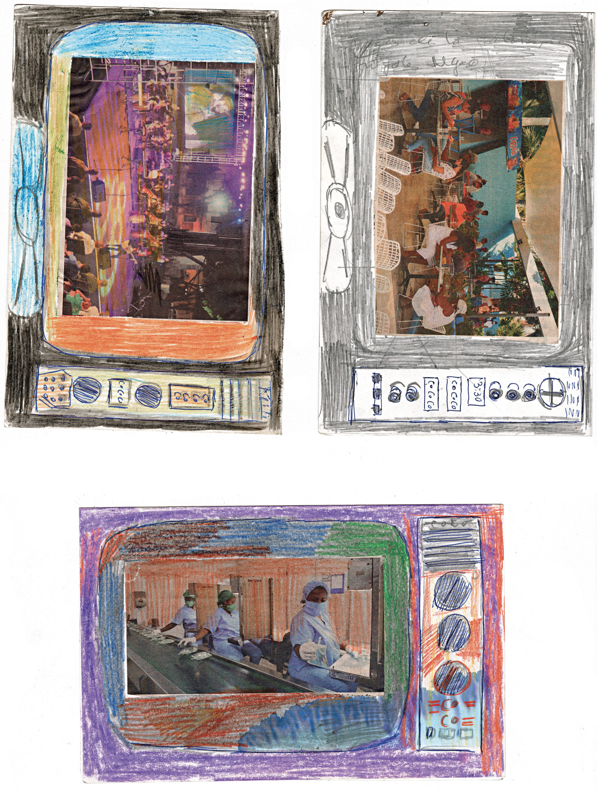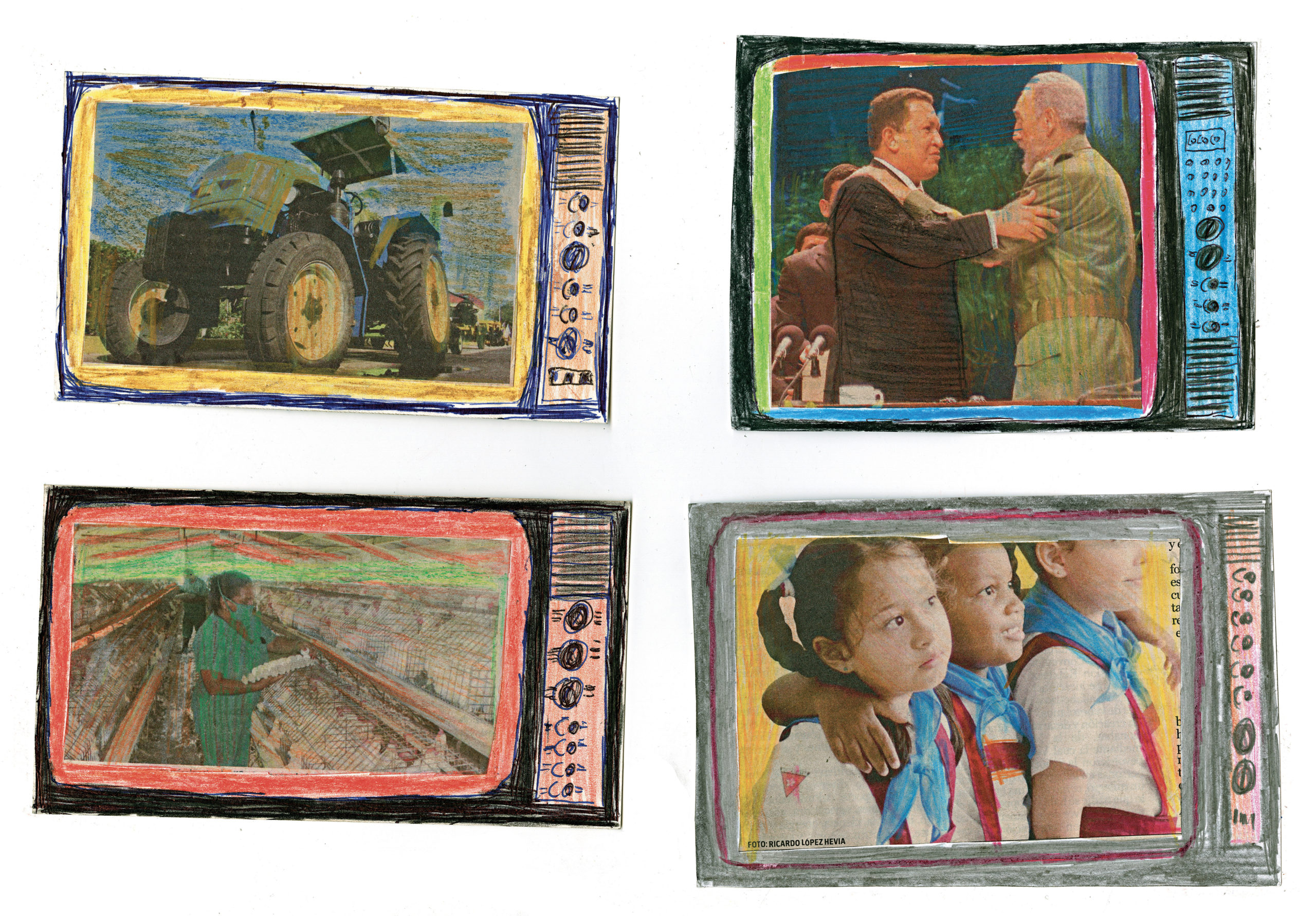 Depuis l’enfance, Martínez Durán découpe ces images d’actualité et de propagande pour les insérer dans des téléviseurs en carton qu’il fabrique : ses collages deviennent les images diffusées à l’écran. Deux temporalités s’y superposent, montrant l’écart entre le quotidien et des photos souvent dépassées.