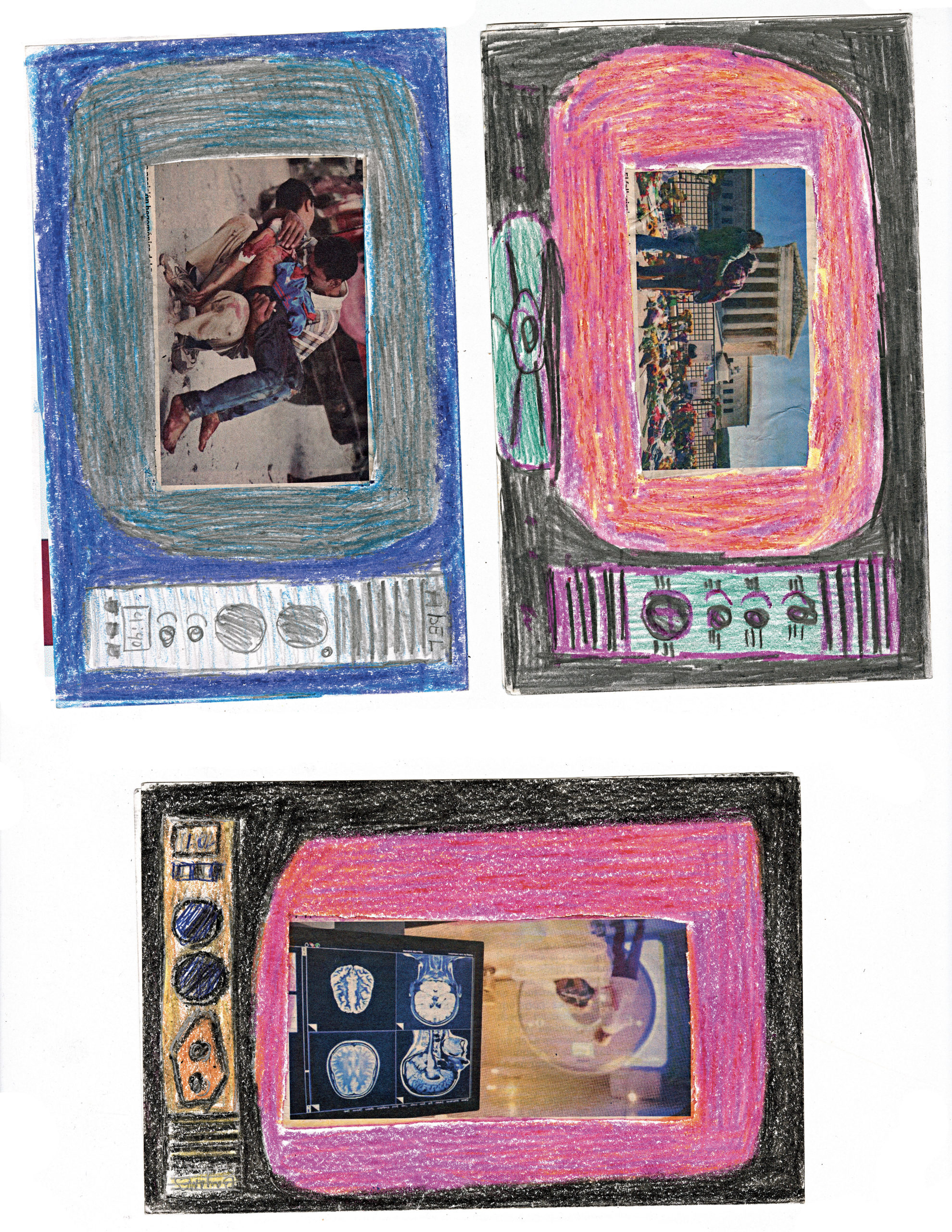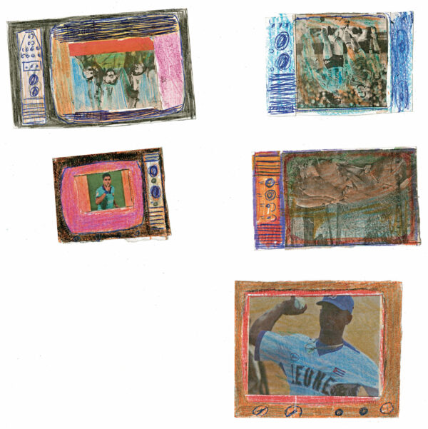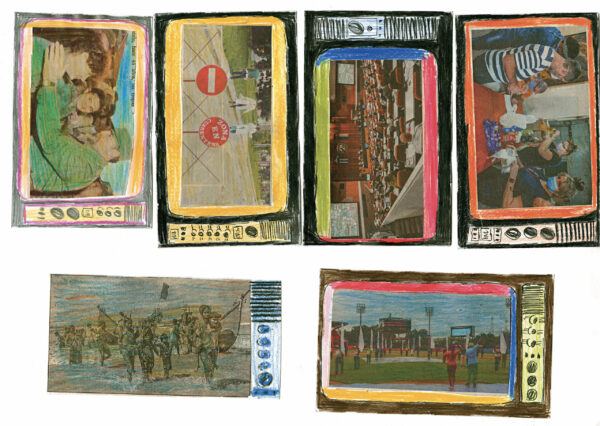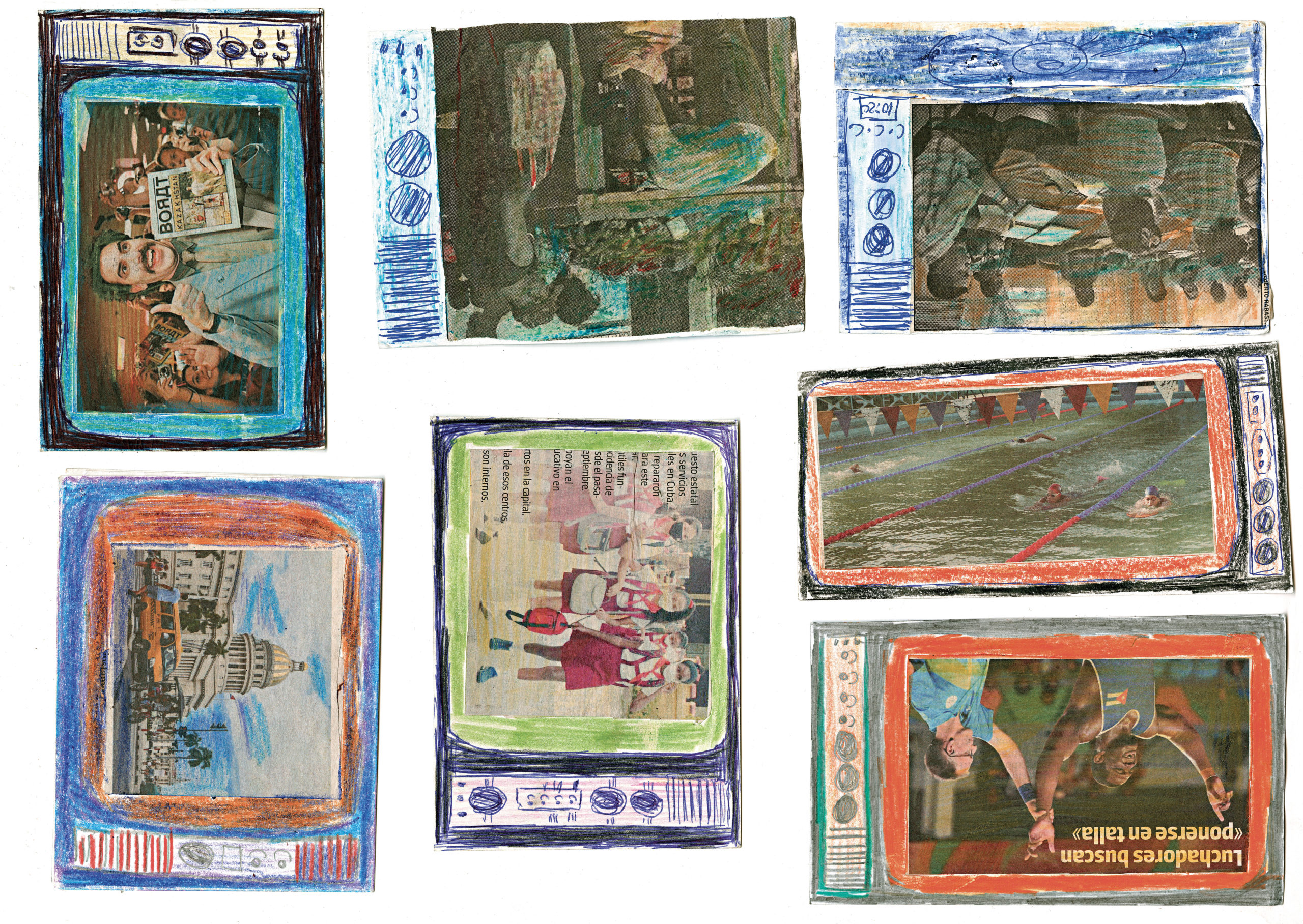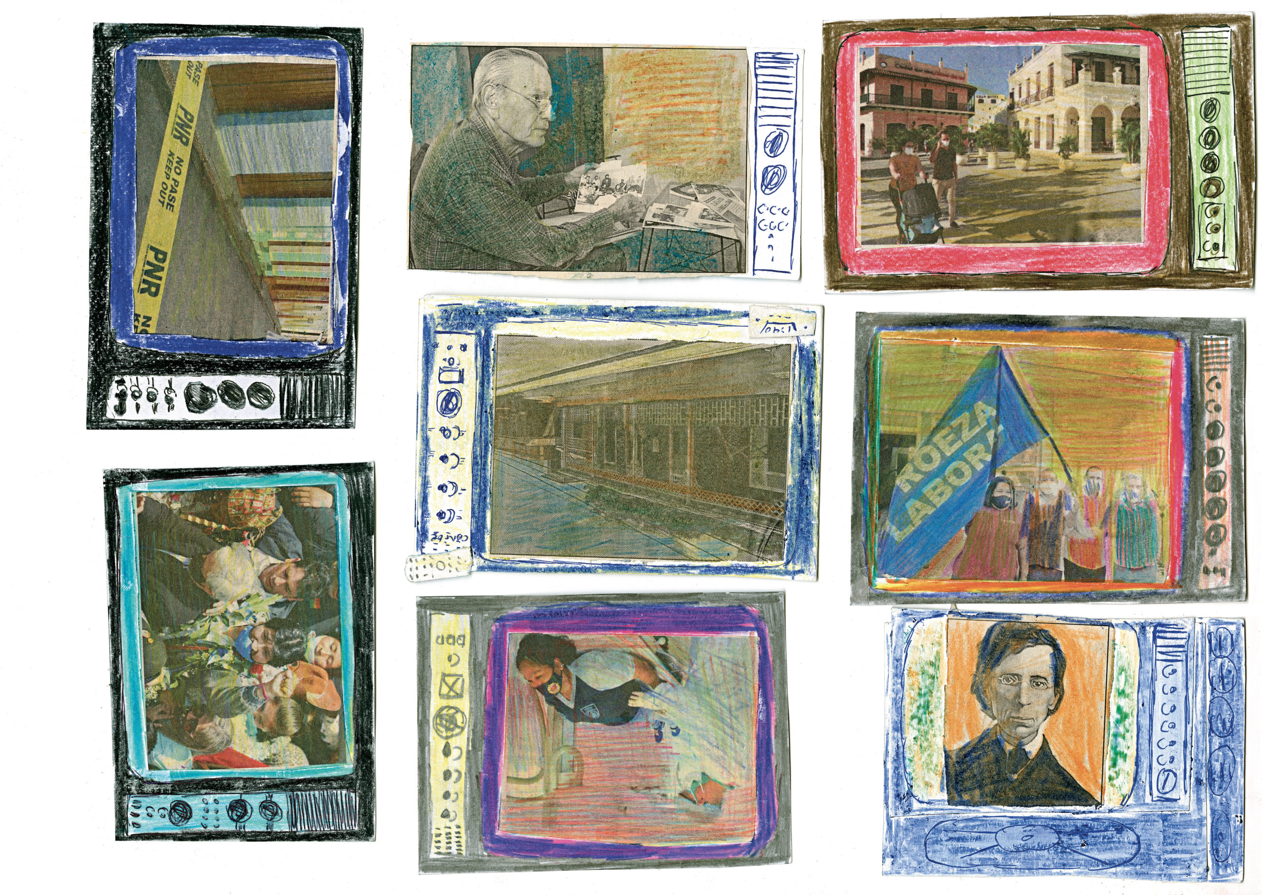 Depuis l’enfance, Martínez Durán découpe ces images d’actualité et de propagande pour les insérer dans des téléviseurs en carton qu’il fabrique : ses collages deviennent les images diffusées à l’écran. Deux temporalités s’y superposent, montrant l’écart entre le quotidien et des photos souvent dépassées.