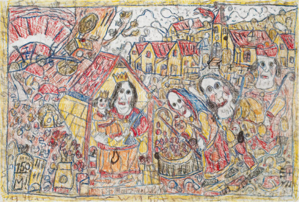Theodor Wagemann spent his adolescence smuggling food in the small village near Aachen where he grew up. One day, customs officers caught him and shot at him to intimidate him. The incident left such a mark that he gradually withdrew into himself. Although he escaped the Nazi program of exterminating the mentally ill thanks to his family doctor, Wagemann was forcibly sterilized. He gradually began hoarding waste in his room, leading his family to have him institutionalized at age 61. In the hospital, he began drawing intensively, often on wax paper salvaged from kitchens.