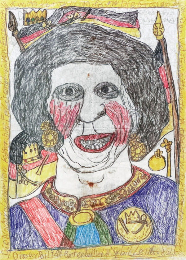 Wagemann created portraits of Nazi dignitaries, including nearly eight hundred of Adolf Hitler. His drawings are accompanied by text on the reverse and xenophobic slogans mixed with sequences of numbers indicating dates, all associated with the Third Reich. His iconography also includes biblical scenes and contemporary figures he cut from magazines.