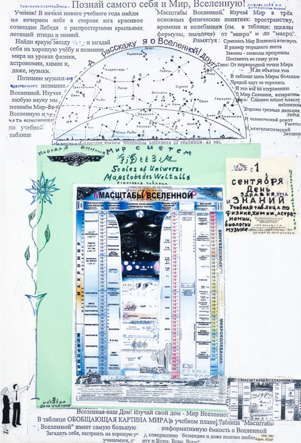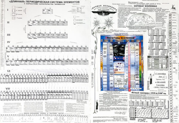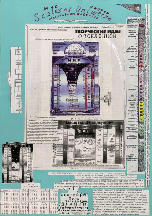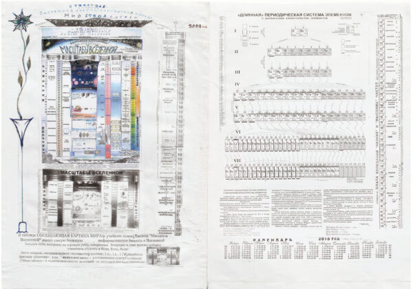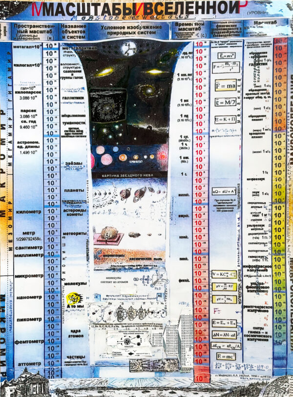 Medvedev used to teach geography and astronomy in Nizhny Novgorod. He is the author of numerous scientific studies and has lectured at conferences on space probes and the structure of the universe. His specialization is in vibrations: He claims that the laws of the universe’s vibrational motion are based on the relationship and ratio between distance and time. When he was 35, a cardiovascular disease caused him to lose his hearing, and during this time he gradually began to change his way of thinking. Applying his scientific knowledge to a brand new artistic and humanist project, he created a painting that he called Tree of Knowledge, which he used to demonstrate the close bond between the macrocosm and the microcosm. By understanding this relationship, he says, we can achieve an equilibrium in life.